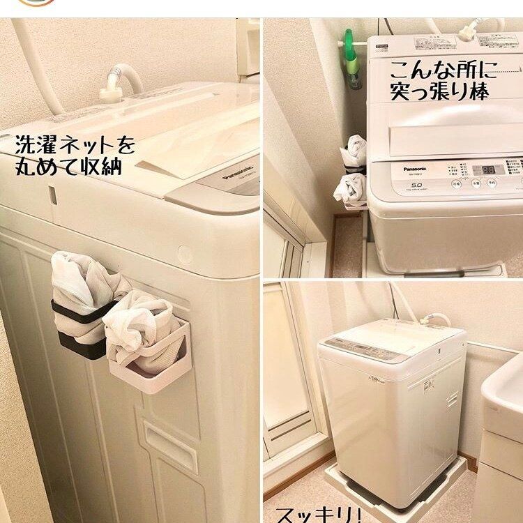 本来は傘立てですが、マグネットを利用して洗濯機にぺたっと貼りつければ、洗濯ネットの収納スペースに早変わり!そのほかにもマグネットがつくところであればデスクまわりなど、家中いろんなところで活躍すること間違いなしです!