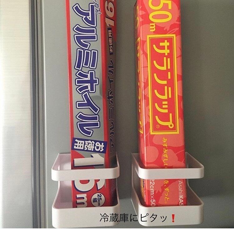 こちらも同じ傘立てをなんと冷蔵庫にペタッ!ラップやアルミホイル置き場に早変わり!1本ずつ入るジャストサイズで使いやすさ抜群です。