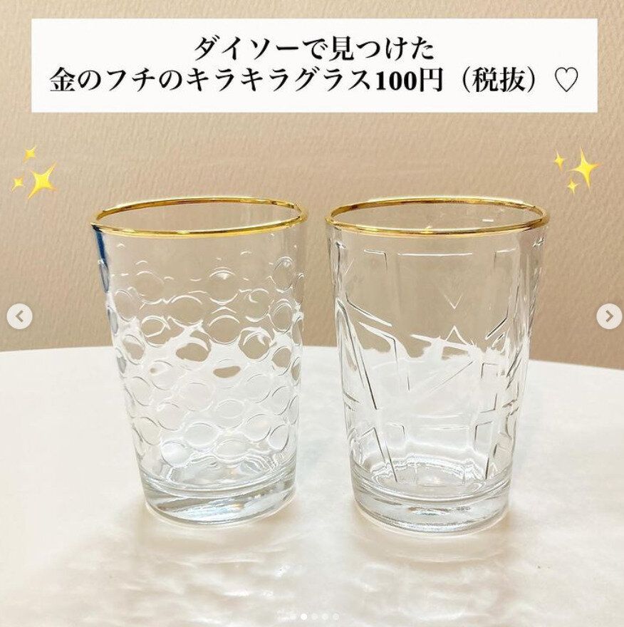 ゴールドのフチがアクセントになった、ダイソーの金線グラス。コップの側面のデザインもおしゃれで、柄ちがいで欲しくなります。205mlタイプで小ぶりなので、使い勝手もいい!と人気ですよ。