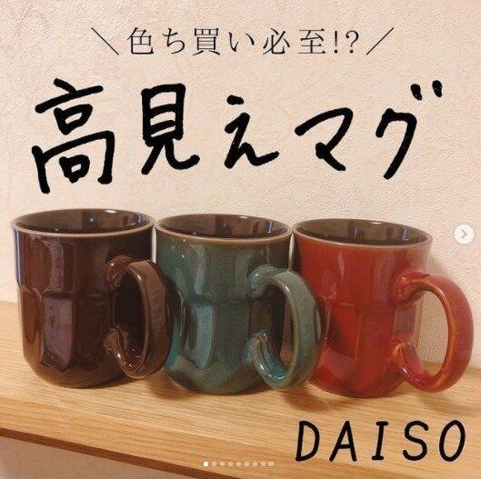 おしゃれな雑貨屋にありそうなデザインが目をひくこちらのマグカップは、ちょっぴりレトロな雰囲気を演出してくれる高見え食器。100均とは思えないデザイン性の高さに加え、カップにしっかり厚みがあるので、持つ手に熱さを感じにくいのもうれしいポイントです。