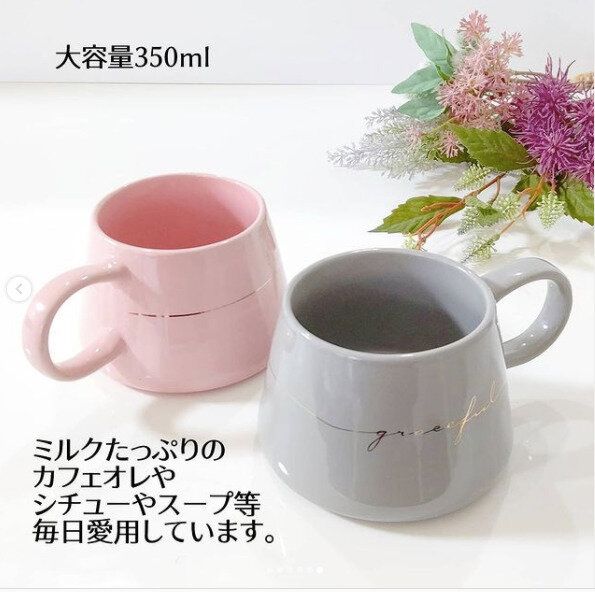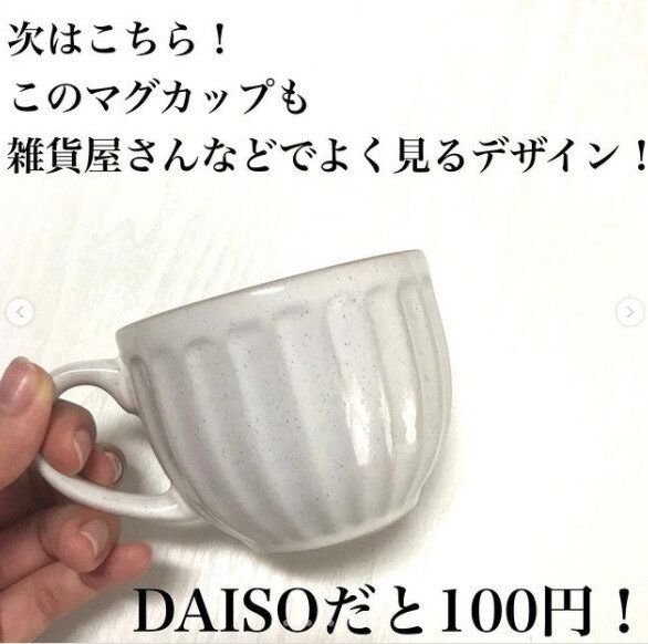 ありそうでないフォルムがかわいいこちらのマグカップは、くすみ感のあるカラーにゴールドのロゴが入っていて、100均とは思えないクオリティの高さが人気の秘密。陶器製で350mlたっぷり入るサイズなので、スープやシチューを入れるのにぴったりの食器です。