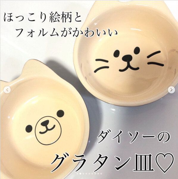 少し小さめサイズの12cmサイズのグラタン皿は使い勝手抜群。しかもダイソーのグラタン皿はアニマル柄のデザインで食べ進めるとお顔が見えてくるといううれしさも。大人だけでなくお子さんも大喜び間違いなしで、これなら好き嫌いなく完食しちゃうかも。