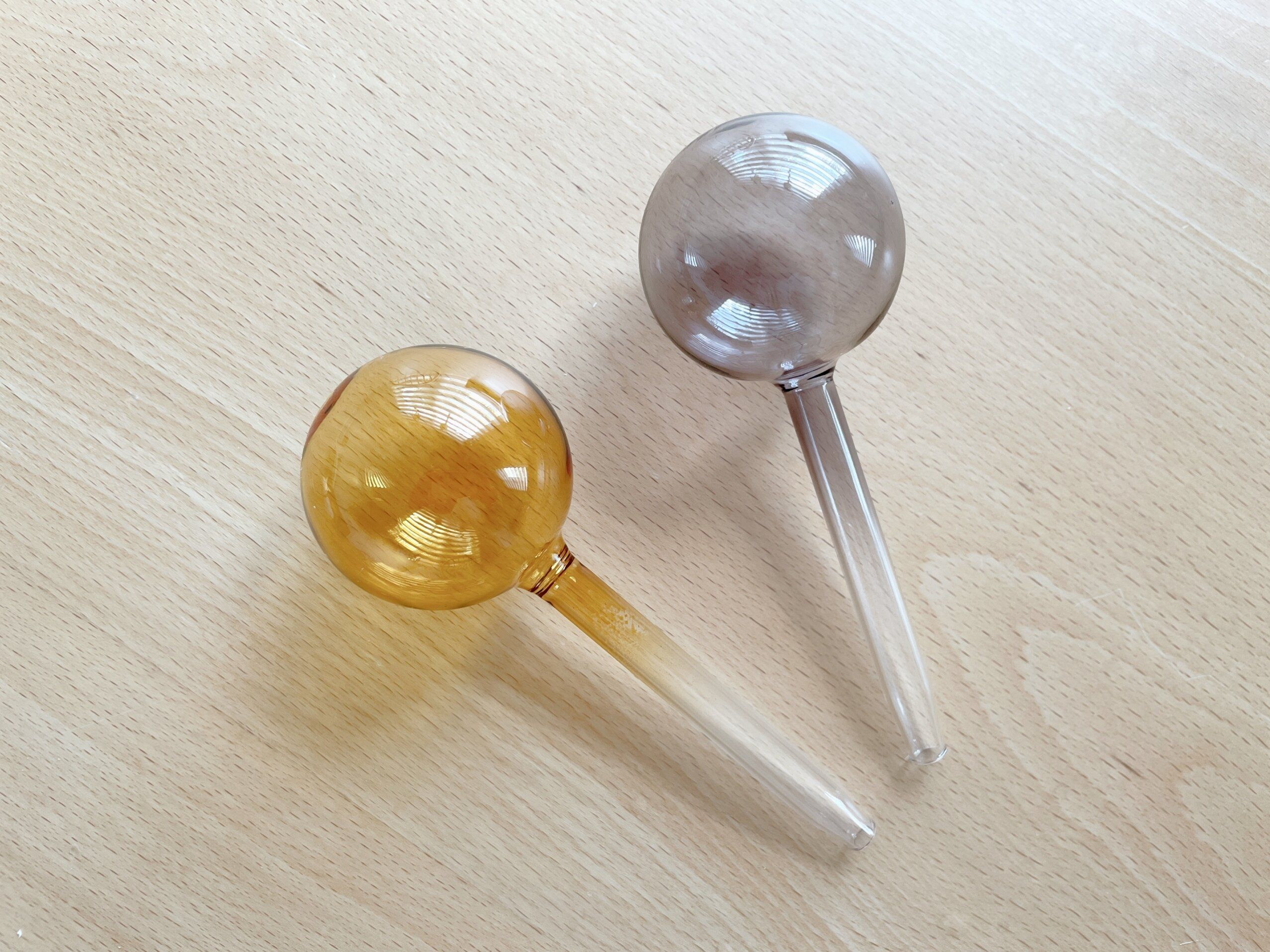 可愛いガラス工芸品、ビードロに見えるこちらは「ウォーターディスペンサー(税込330円)」。カラーはイエロー、チャコールグレー、ブラウンの3色があります。自動給水できるアイテムで水やりを楽にしてくれます。使い方は簡単で、先っぽから水を入れて観葉植物の土部分に差し込むだけ。