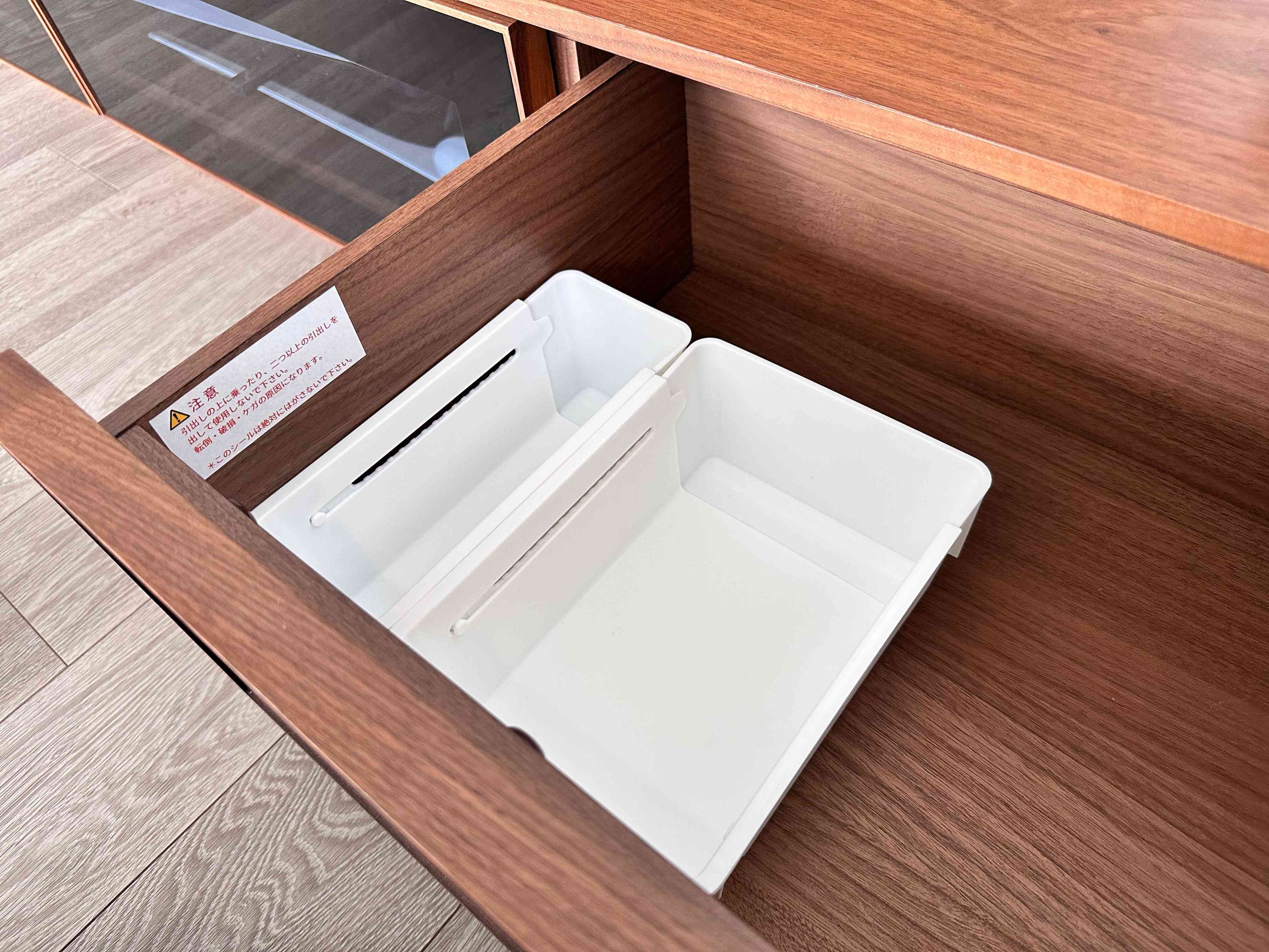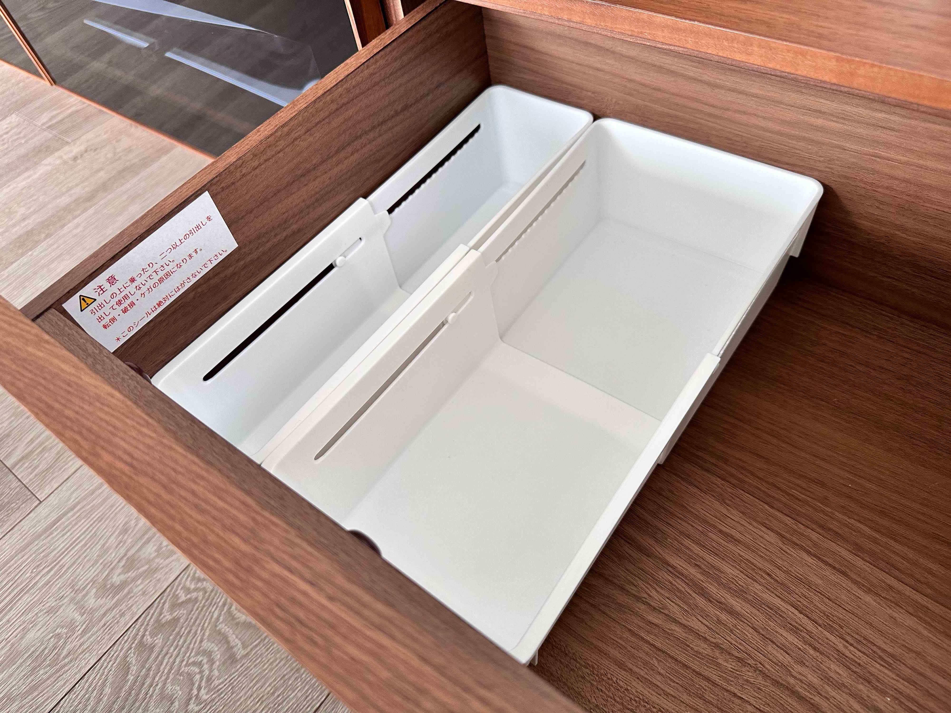 この伸縮トレーを使えば、引き出しのスペースに幅を合わせることができるので、ぴったり収納が可能になります!引き出しにぴったりとケースがおさまると見た目もすっきりするのでおすすめです。ぜひ、お店でチェックしてみてくださいね。