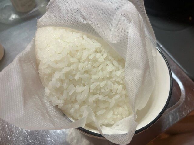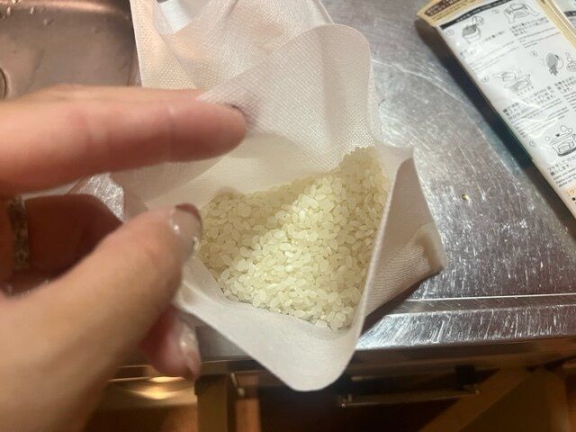 20分後、お湯を捨てお米の袋を鍋に戻し、フタをしてそのまま15分から20分ほど待ちます。