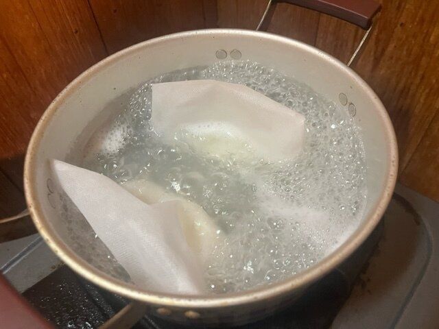深めの鍋に水を入れ、沸騰させたらお米の袋を入れました。お米が全部つかる位が良いとおもい