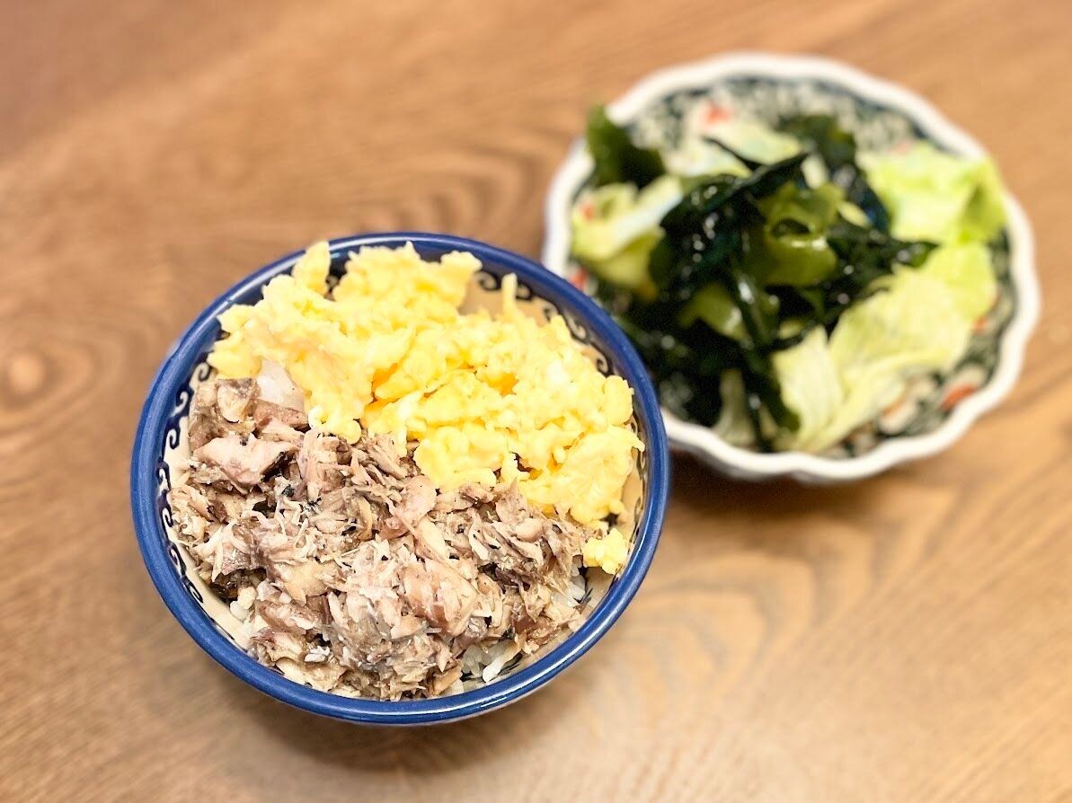 炒り卵と一緒にご飯にのせれば、サバそぼろ丼の完成です。お弁当にもいいですし、冷凍もできますよ。栄養のあるメニューが簡単にできますよね。