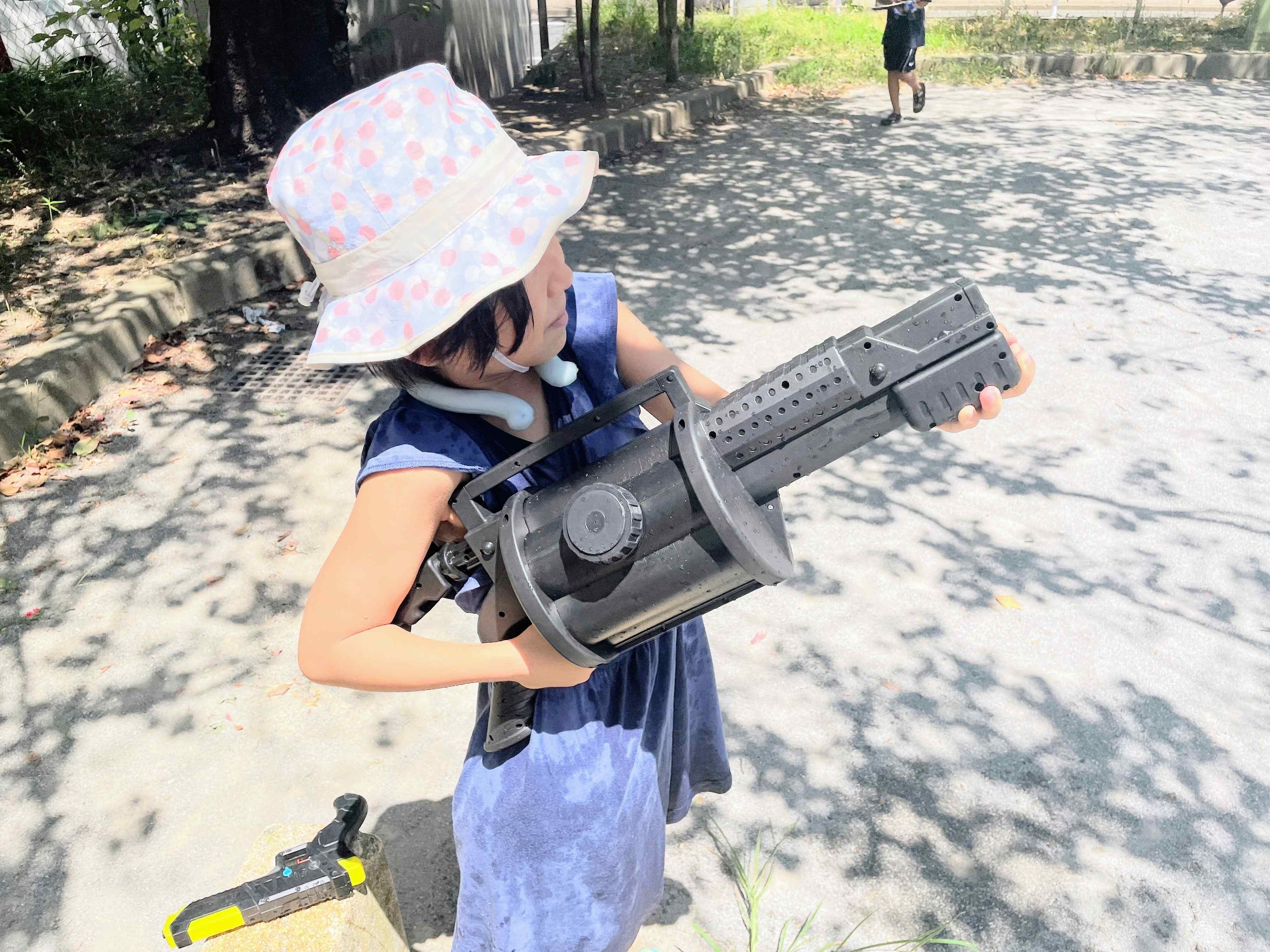 夏は公園で友達と水鉄砲遊びをよくする娘は、「グレネードランチャー」を見ると狂喜乱舞。さっそく友達と水鉄砲合戦です。