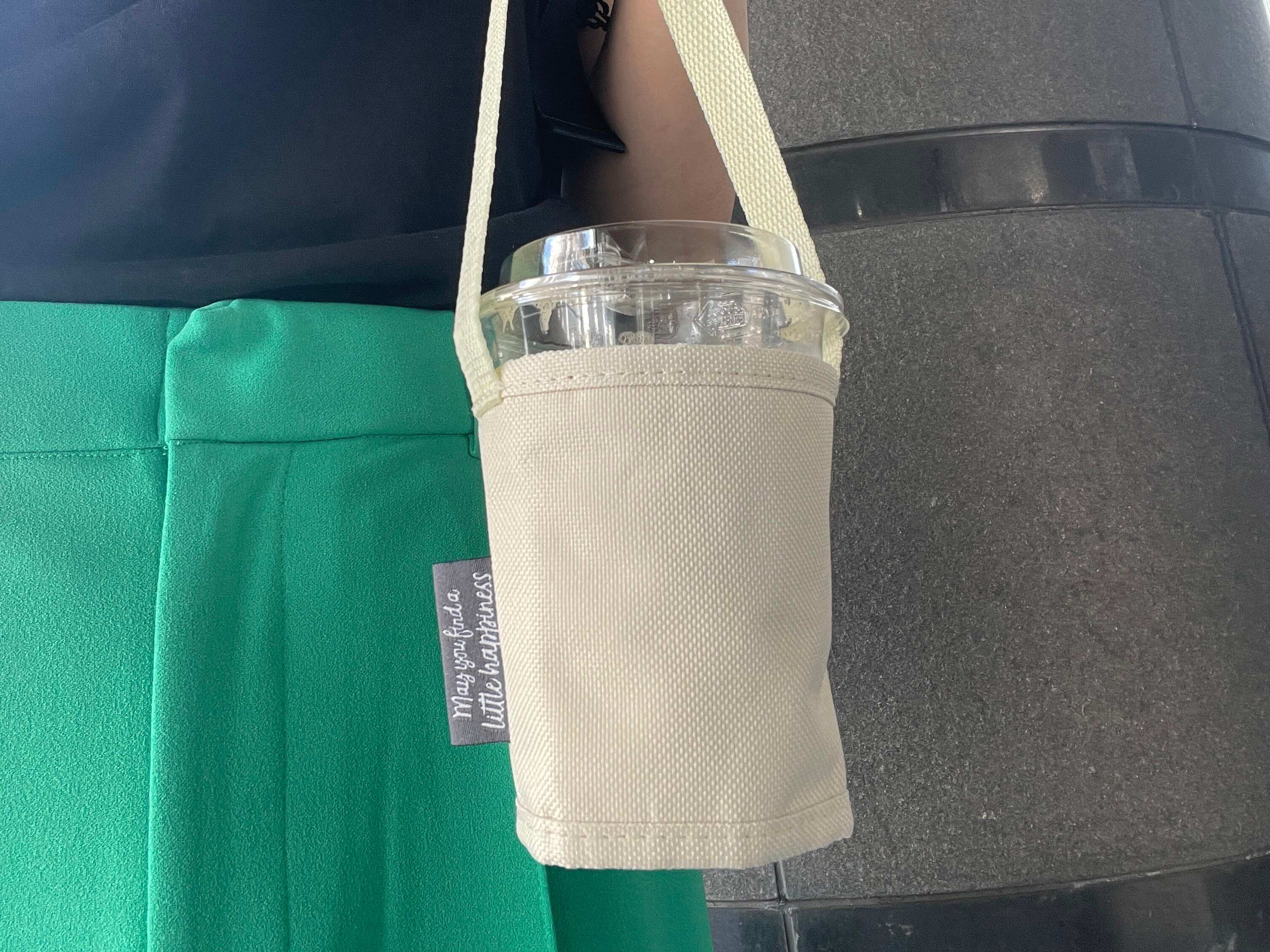 「ドリンクカップホルダー」を使えば、手に持ってもぶら下げられるから、持ち運びがラクです。腕を通して肘に引っかけても大丈夫(フタをしっかりして、こぼれないようには気をつけてください)。