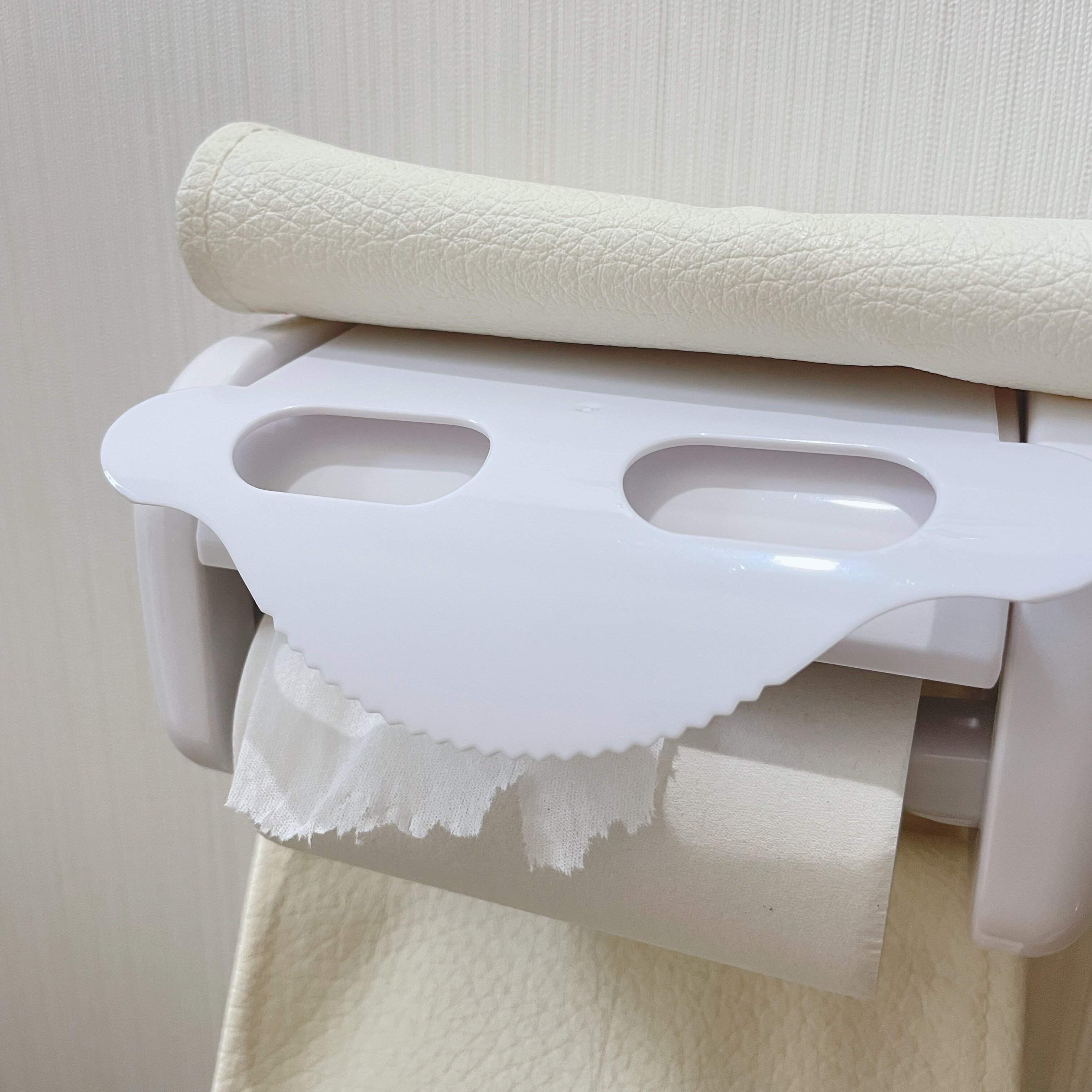 通常の切り口よりも手前に設置することで、トイレットペーパーが少し長めに切れるというもの。