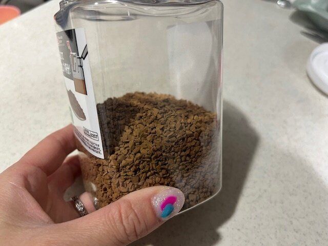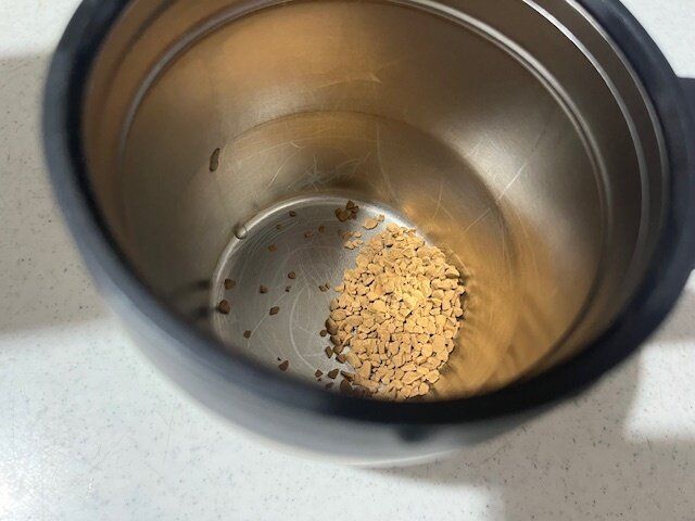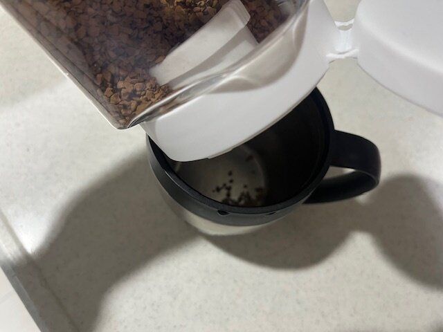 そして、カップに入れてみます。最初のひとふりはなかなか出てきません。何回か振ってみたらサッと出てきました。