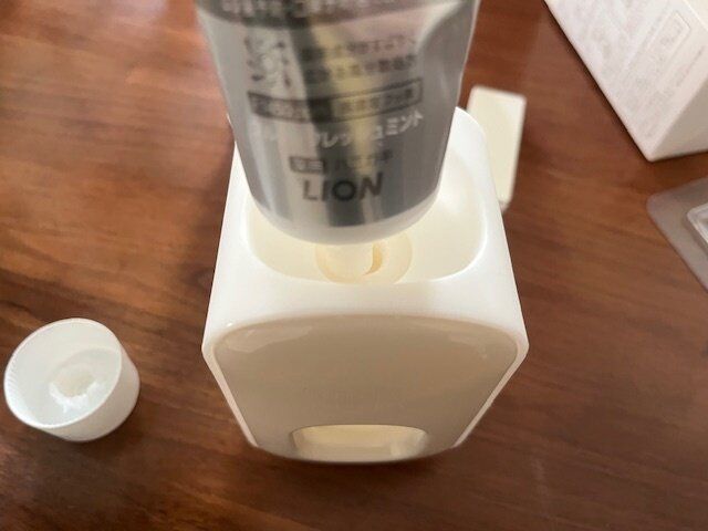 使い方は超簡単。本体に歯ブラシを差し込むだけ。差し込むとチューブが押され歯磨き粉が適量出てきます。