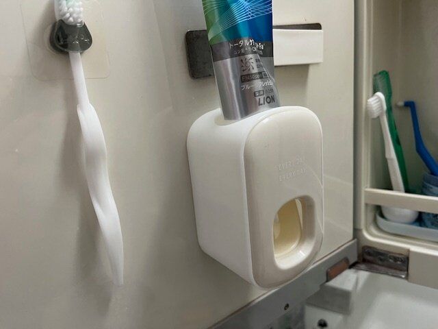 歯磨き粉を差し込んだら、壁面に貼り付けたフックにスライドさせながら取り付ければセット完了です。