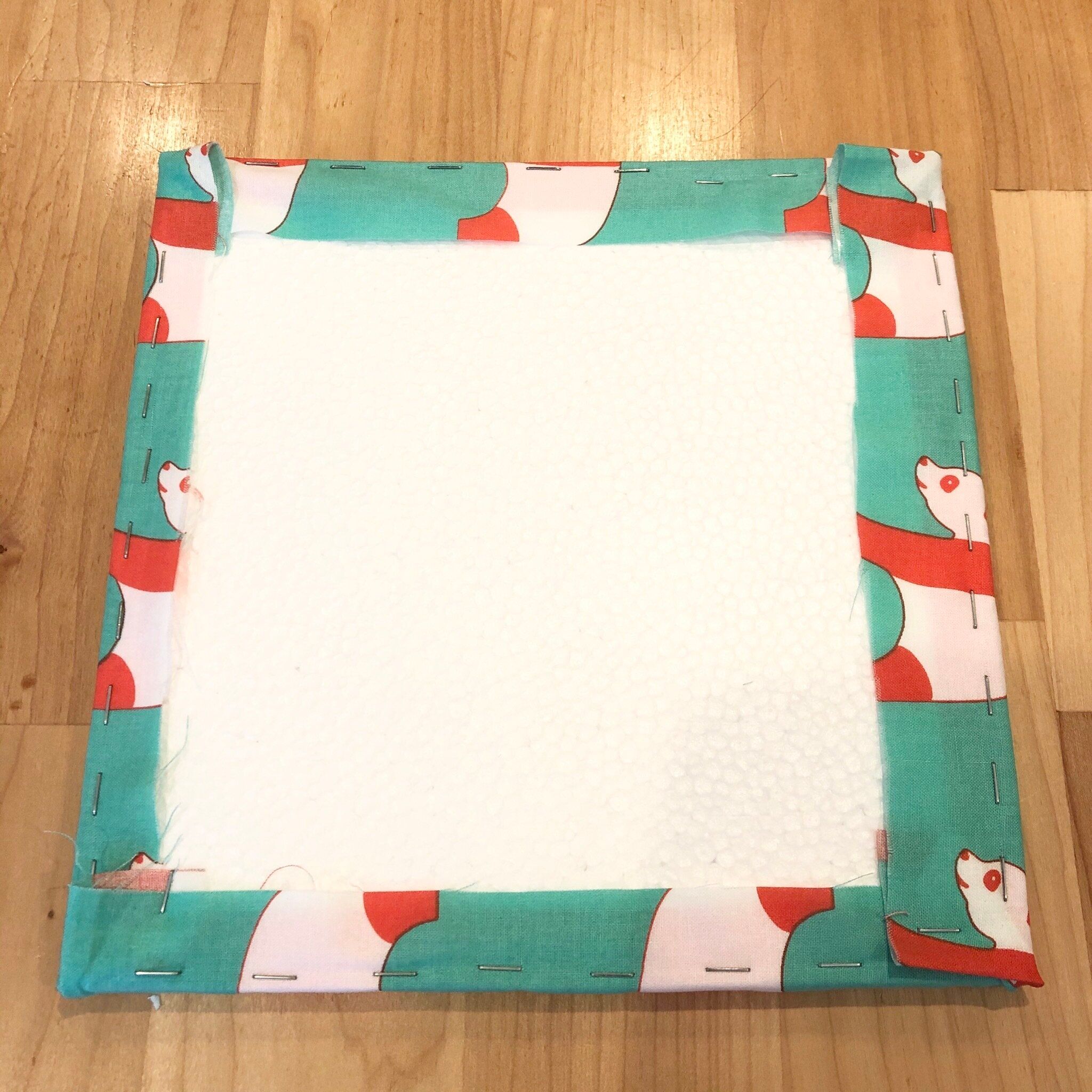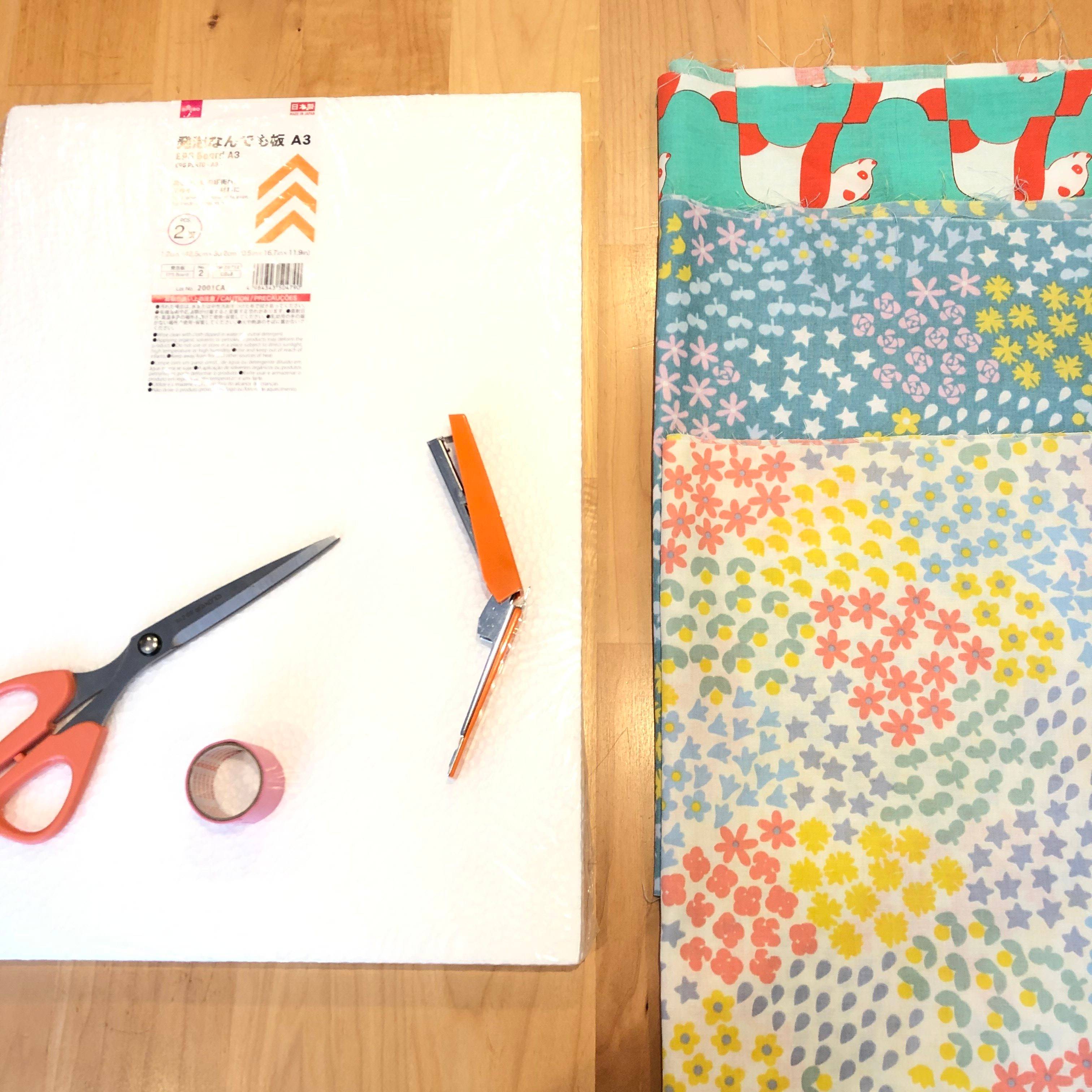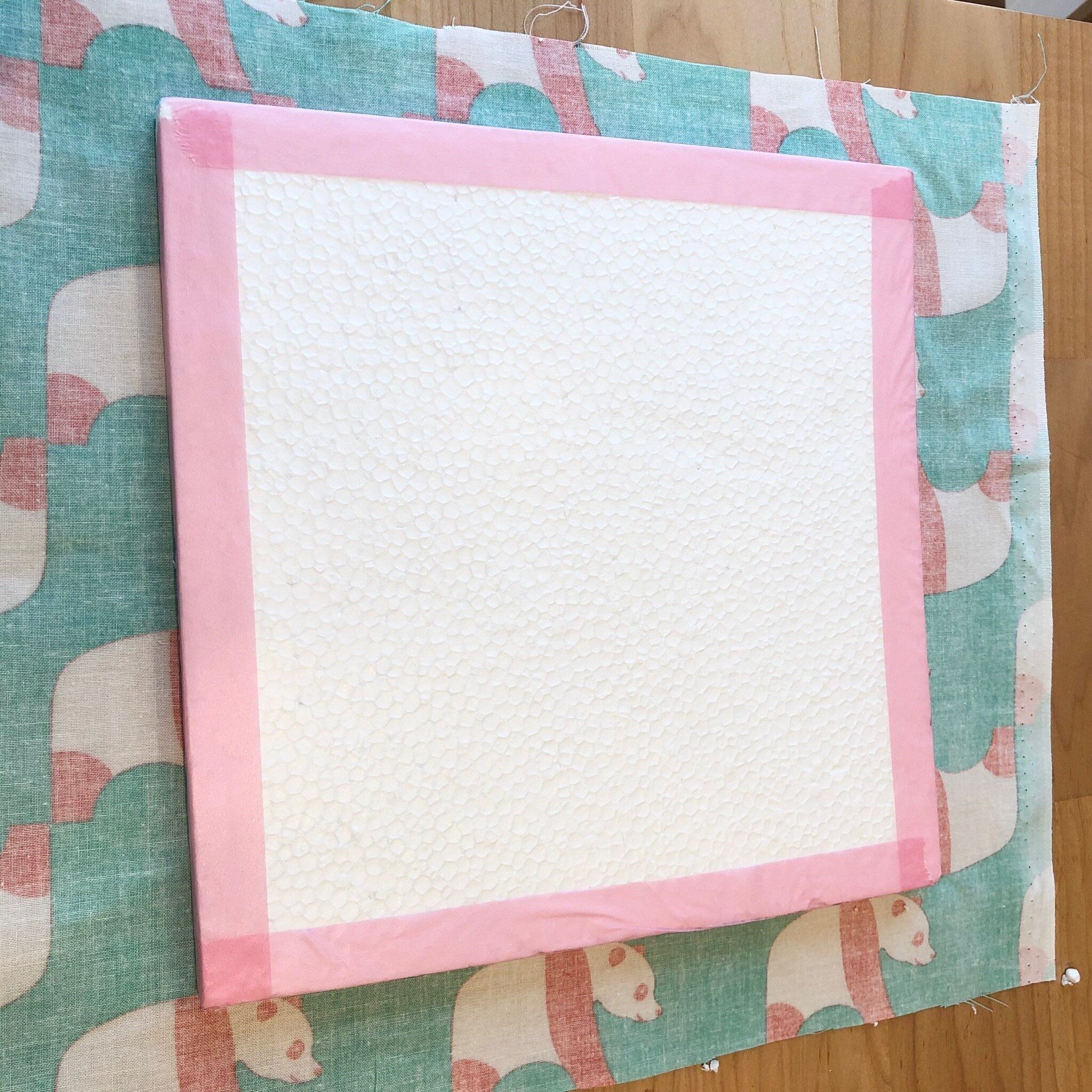 布の柄を下にして置き、その上の中央に発泡スチロールを置きます。