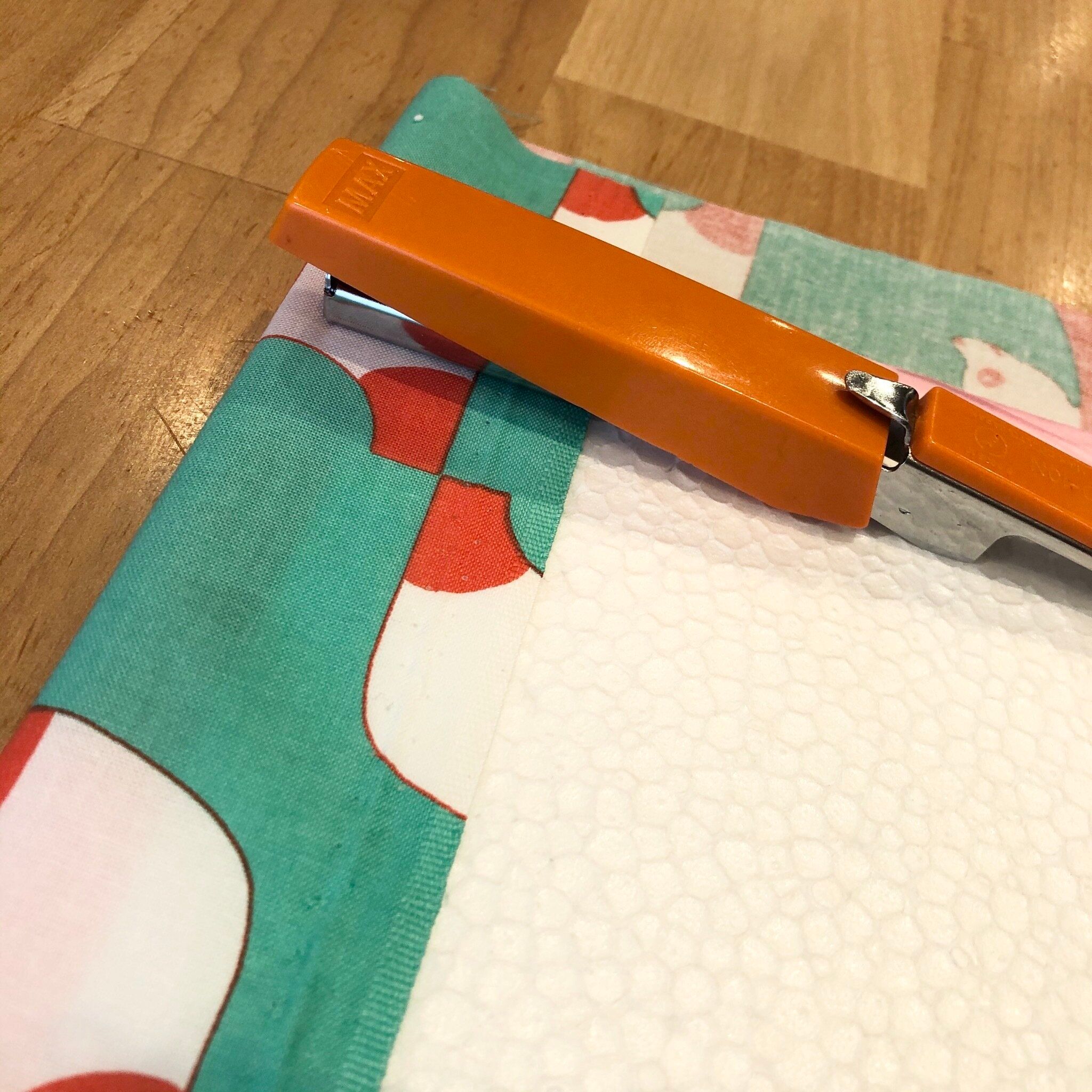 ホッチキスを開いて、発泡スチロールに強く押し当てると芯が刺さってとめられます。
