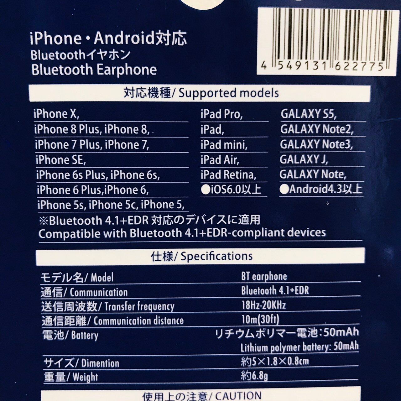 iOS6.0以上のiPhoneやAndroid4.3以上のスマートフォンなど、Bluetooth4.1+EDR対応のデバイスに適応しています。箱の中には(左から)①USBケーブル、②イヤホン本体(イヤーピースつき)③イヤーフック、そして説明書が入っています。