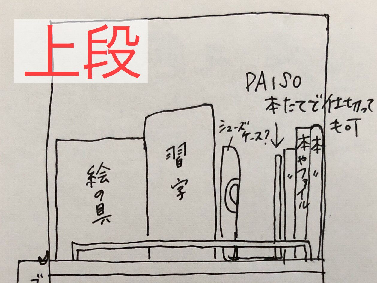 となると、上段は息子さんが引き出して使うことは難しいと思われます。なので、そのままの棚として使えるように、上段下段バラバラに入っていた絵の具セットや習字セットを上段にまとめ、立てて収納したらどうかと考えました。下段に入っているシューズケースもその隣に立てて収納してみてはいかがでしょう。または、棚の横にフックをつけてひっかけて収納するのも手だと思います。