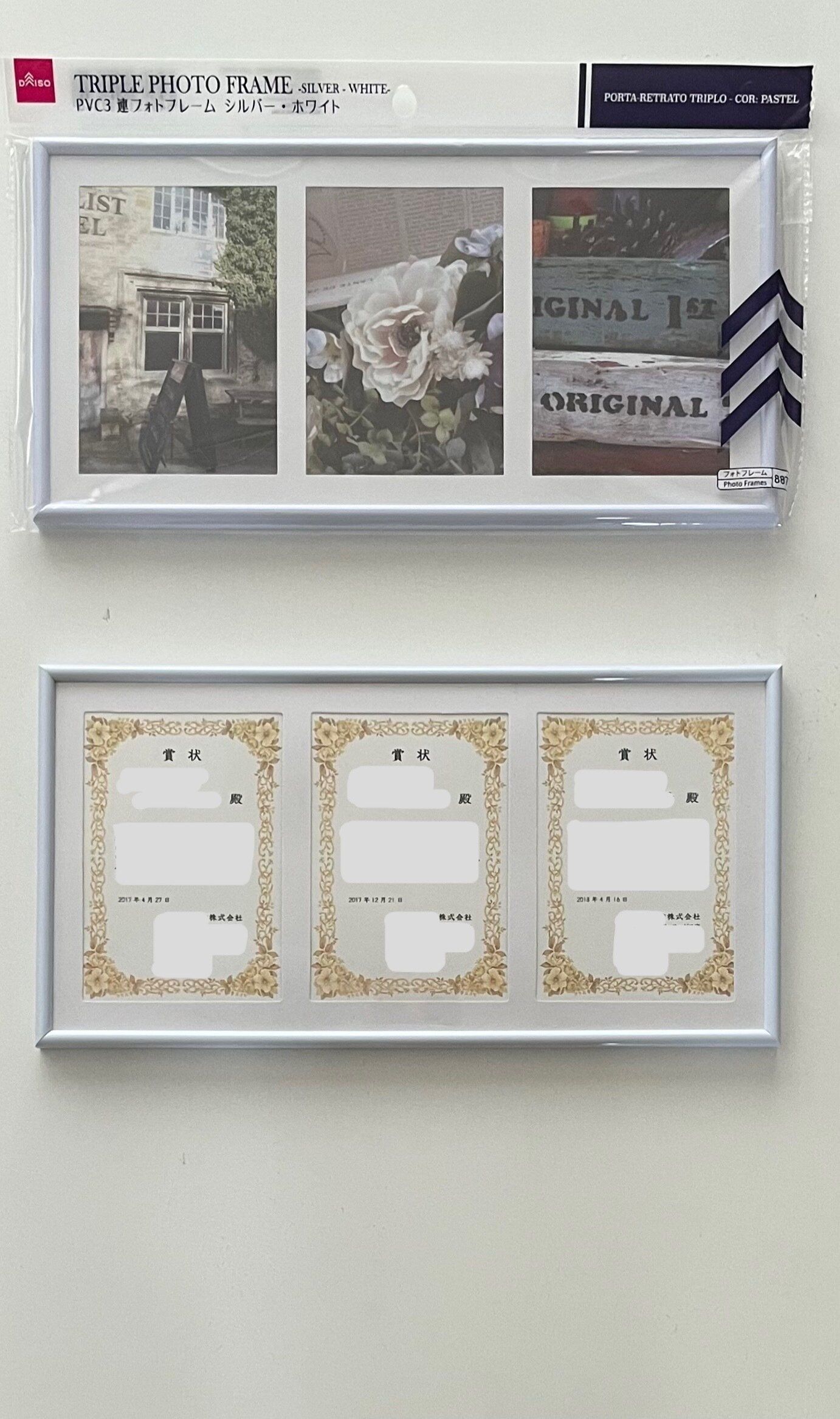 仕事で表彰された時の賞状が数回分になり、A4サイズを並べるとスペースを取ってしまうので、縮小カラーコピーをして飾りました。