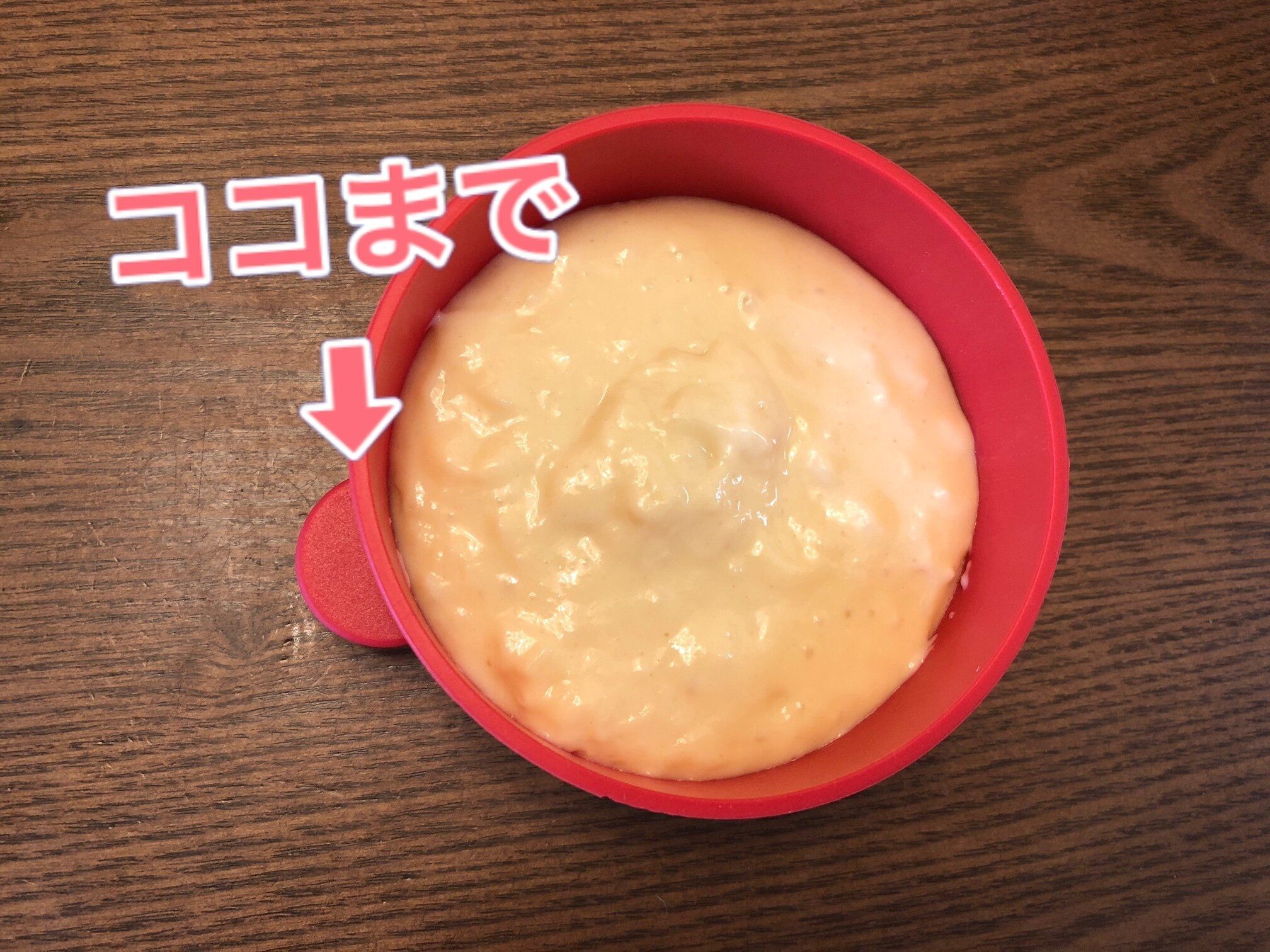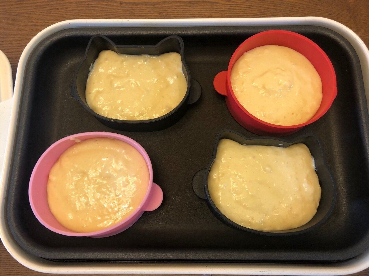 油を薄く塗ったシリコン型に、生地を流し入れます。持ち手の部分の少し下くらいを目安に入れて下さい。入れすぎると膨らんだときに溢れてしまうので、少し少ないかな?くらいの量でちょうどいいと思って下さい。