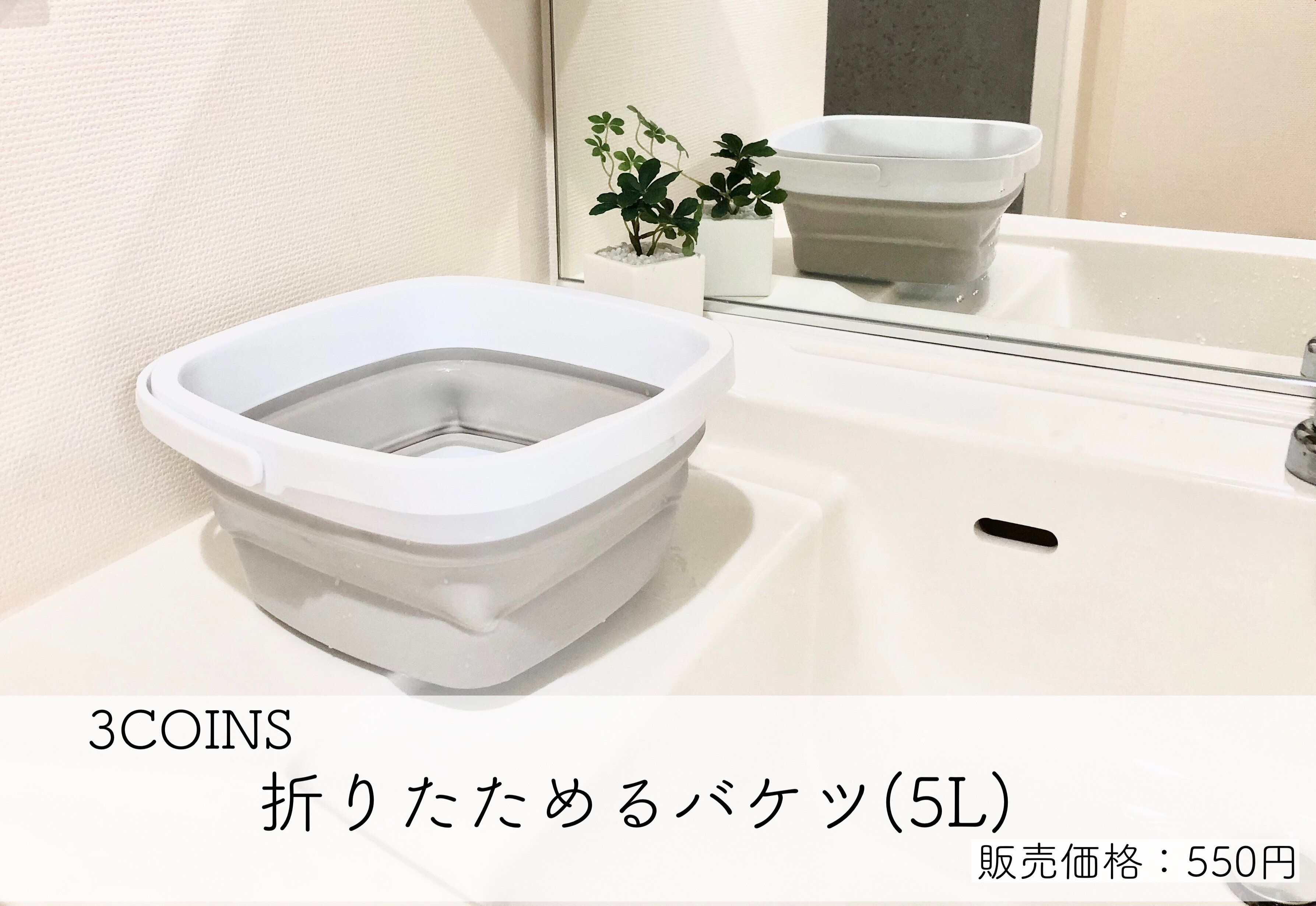 その中でも3COINSの折りたためるバケツが、ちょっと小ぶりなサイズで使い勝手が良く、優秀なのはご存知でしょうか?