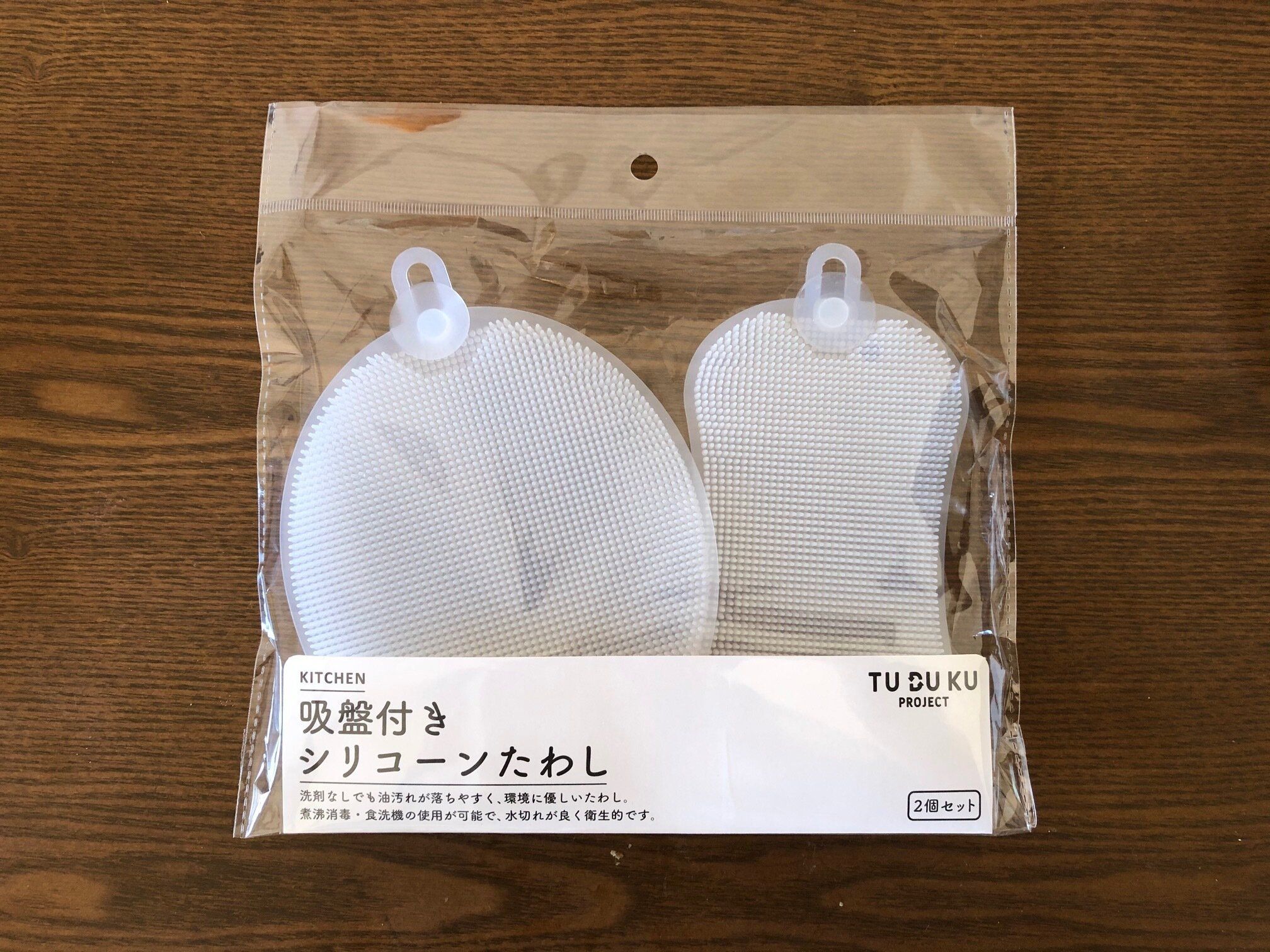 急いでスリーコインズに走り、手に入れてきた商品が「吸盤付きシリコーンたわし」です。1つ入りかと思いきや、大小二つ入りで330円!お得です。また、吸盤付きなので、シンクやキッチンの壁などに貼り付けておくこともできますよ。