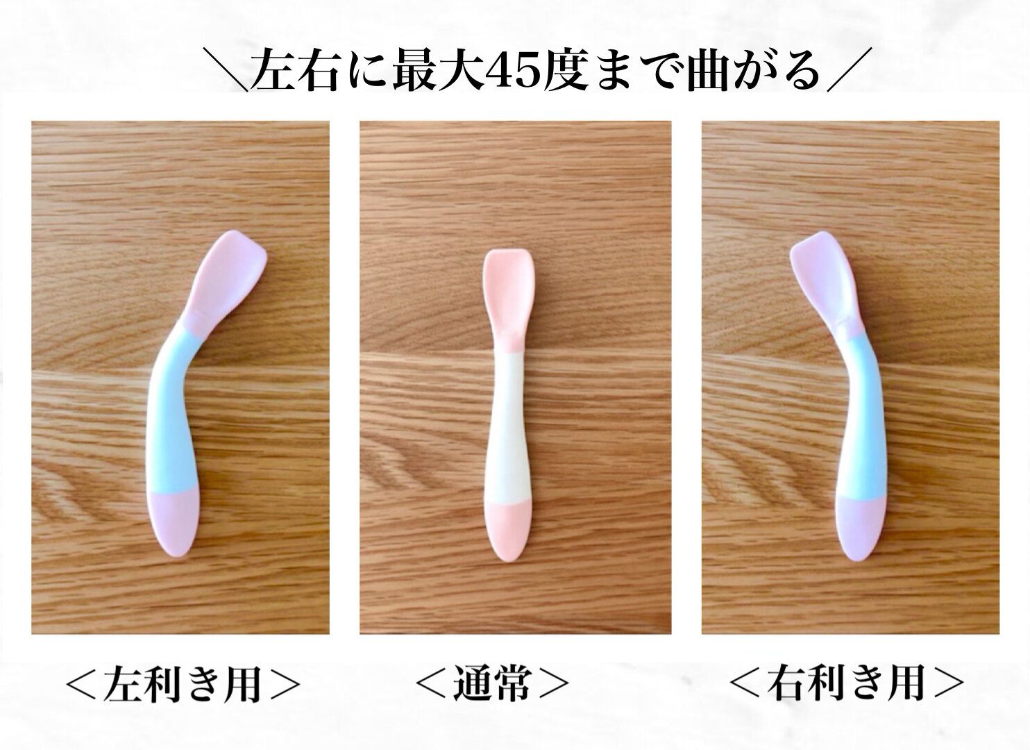 子供の対面に座っても、左右どちらの横に座っても、その場所に合わせて食べさせやすい向きにスプーンを曲げられます。