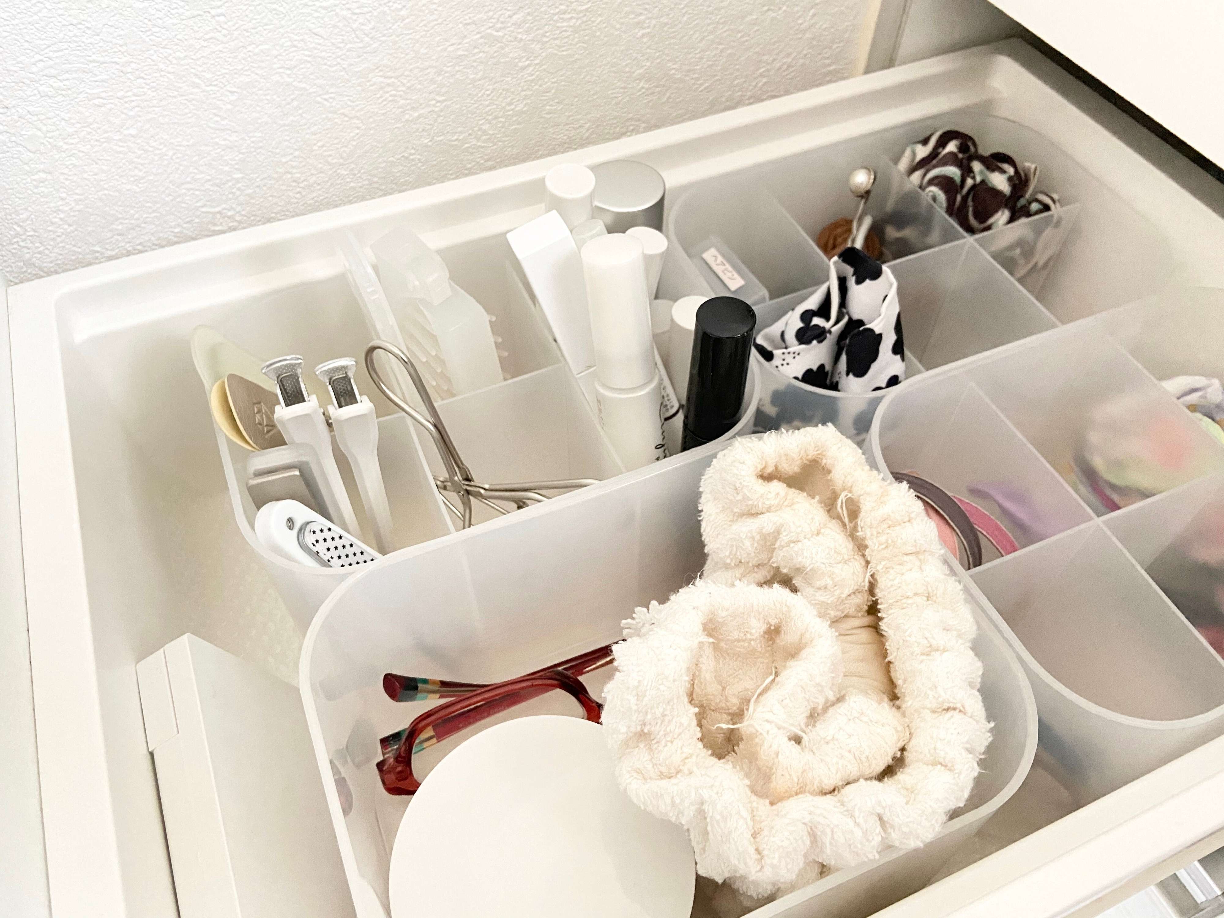洗面所の引き出し収納に使っているのが、小・仕切り付き3つと小・深型1つ。
