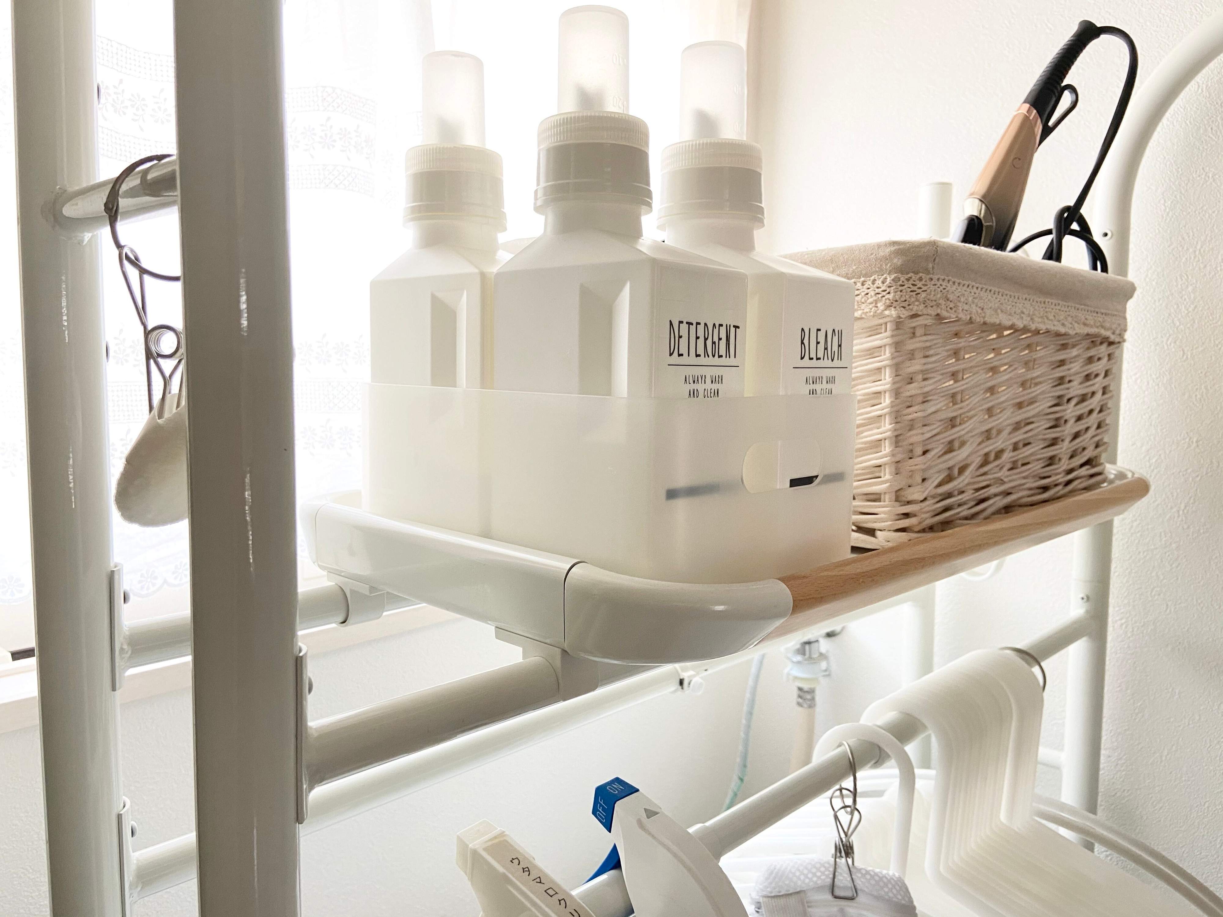 なくても問題ないように感じるかもしれませんが、これがあるとないとでは大違いなんです。このボックスを置くことで定位置を確保し、かつ倒れてくるのを防止しています。また写真では見えないのですが、洗濯洗剤、漂白剤、オキシクリーンの3つのボトルと洗濯ネットを2つ収納しています。