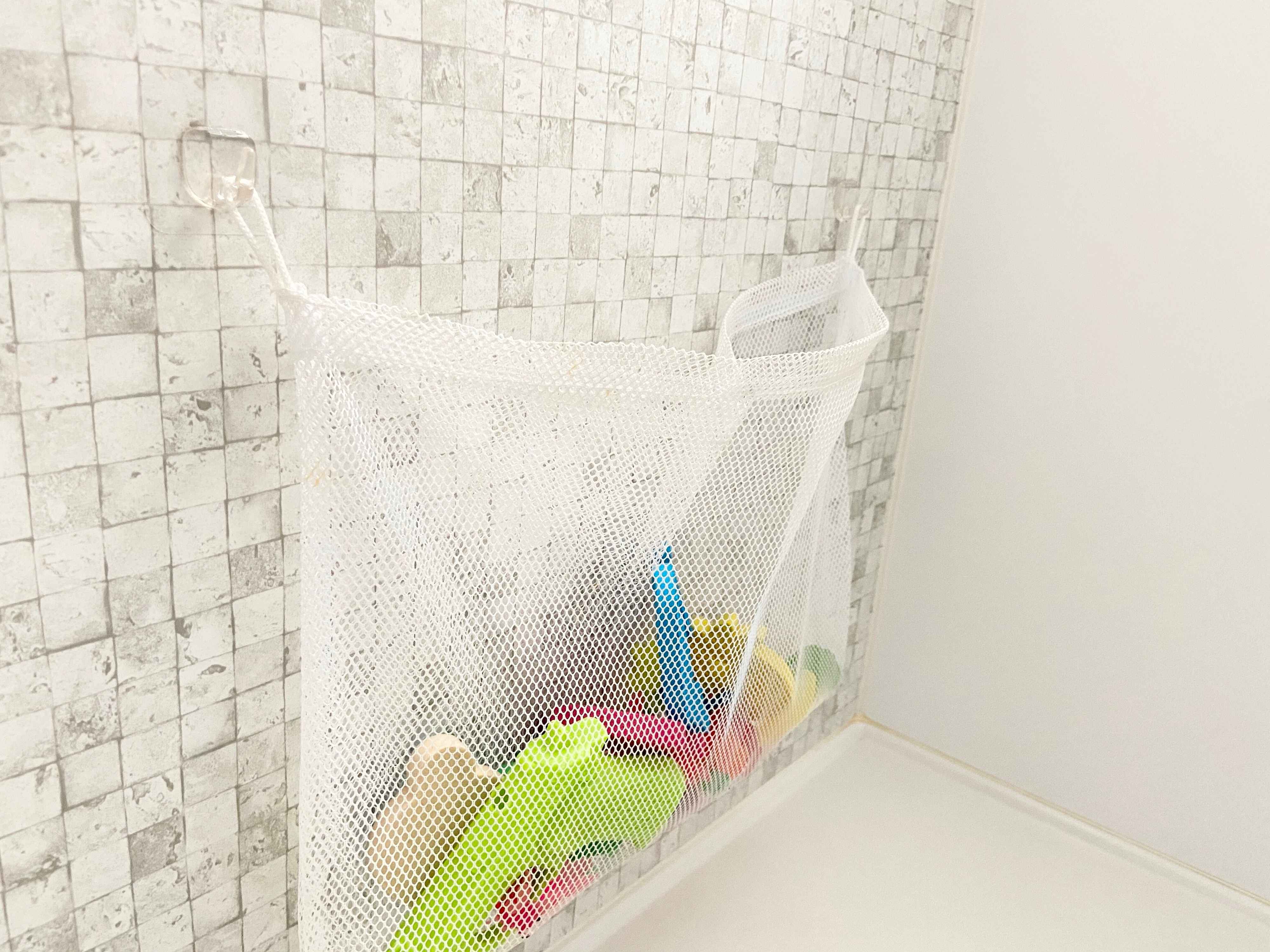 フィルムフックの固定タイプ・小は我が家で一番使用しているものになります。お風呂場では一番下の2歳長男用のオモチャをフィルムフックに吊るして浮かし収納にしています。