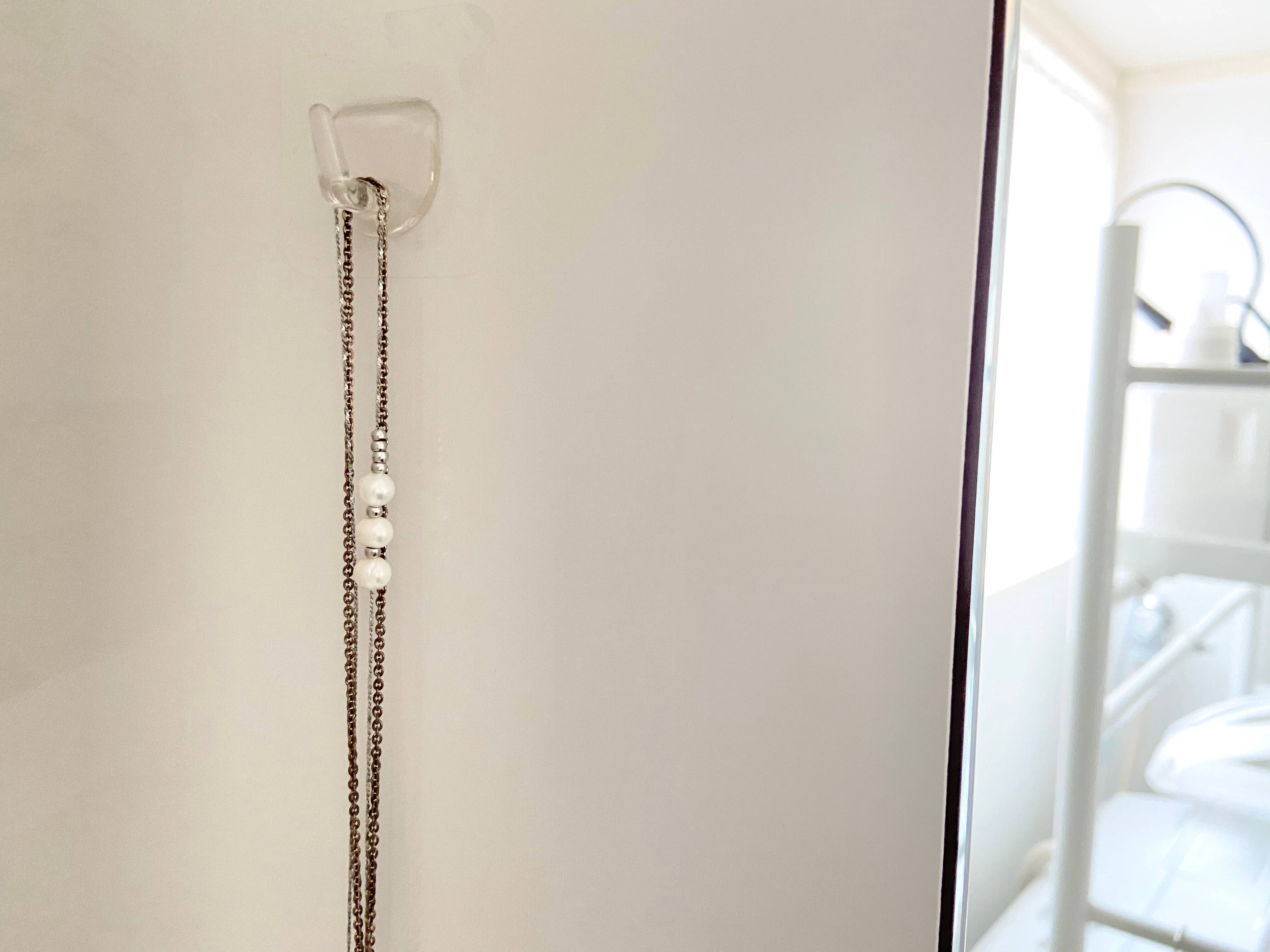 洗面所の3面鏡裏も2箇所使っています。1箇所は私用でネックレスの収納に。もう1箇所はパパさん用で鼻毛ハサミを引っ掛け収納に。