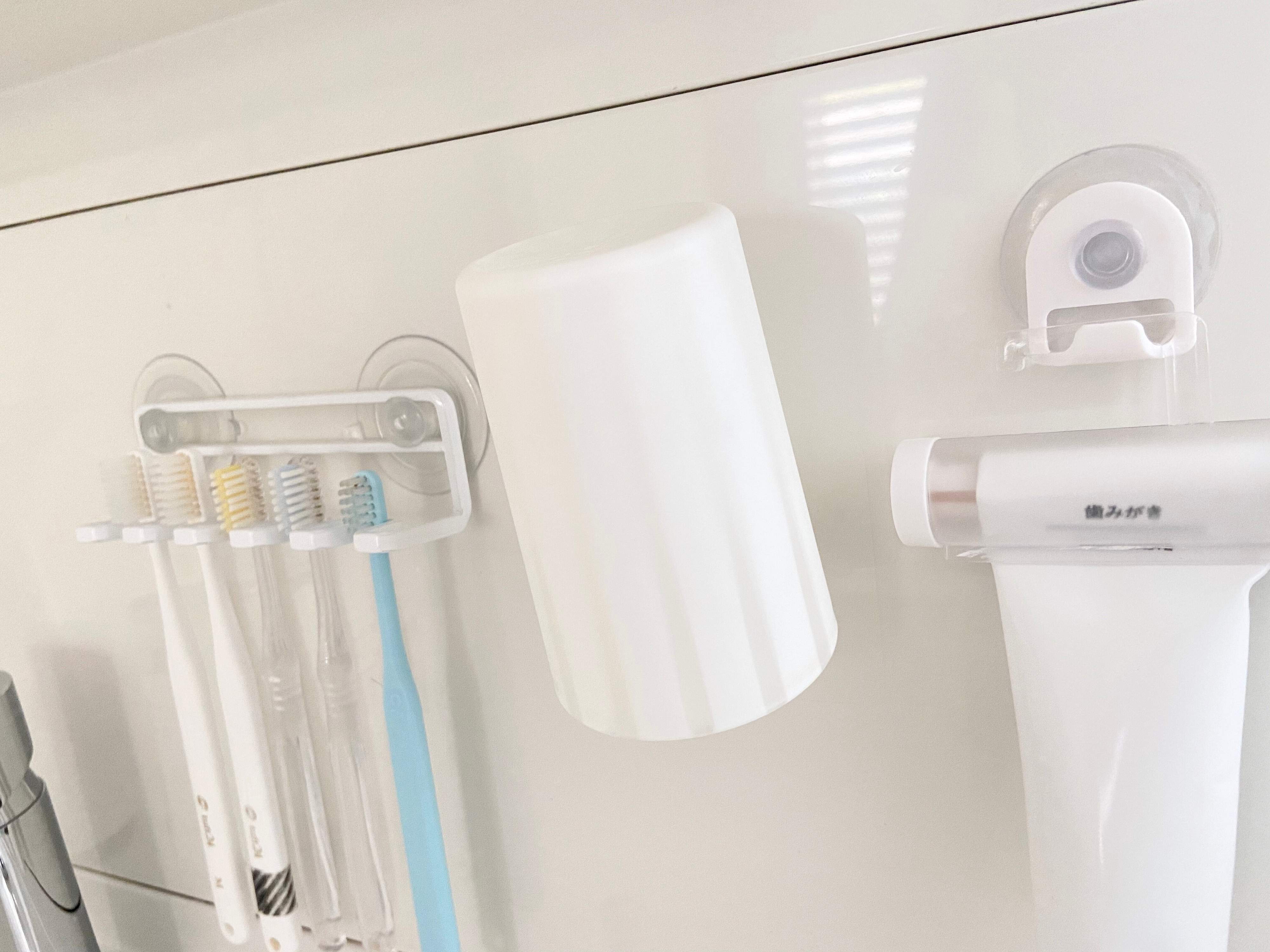 最近取り入れたのがフィルムフックコップホルダー。前までは超強力マグネットをコップの裏にボンドで貼り付けて、ステンレス補助プレートにくっつけて浮かし収納にしていたのですが、ず〜っと使っていると、時々落ちてくることがあり、その度にボンドを貼り直すのが面倒になったので、こちらに入れ替えました。