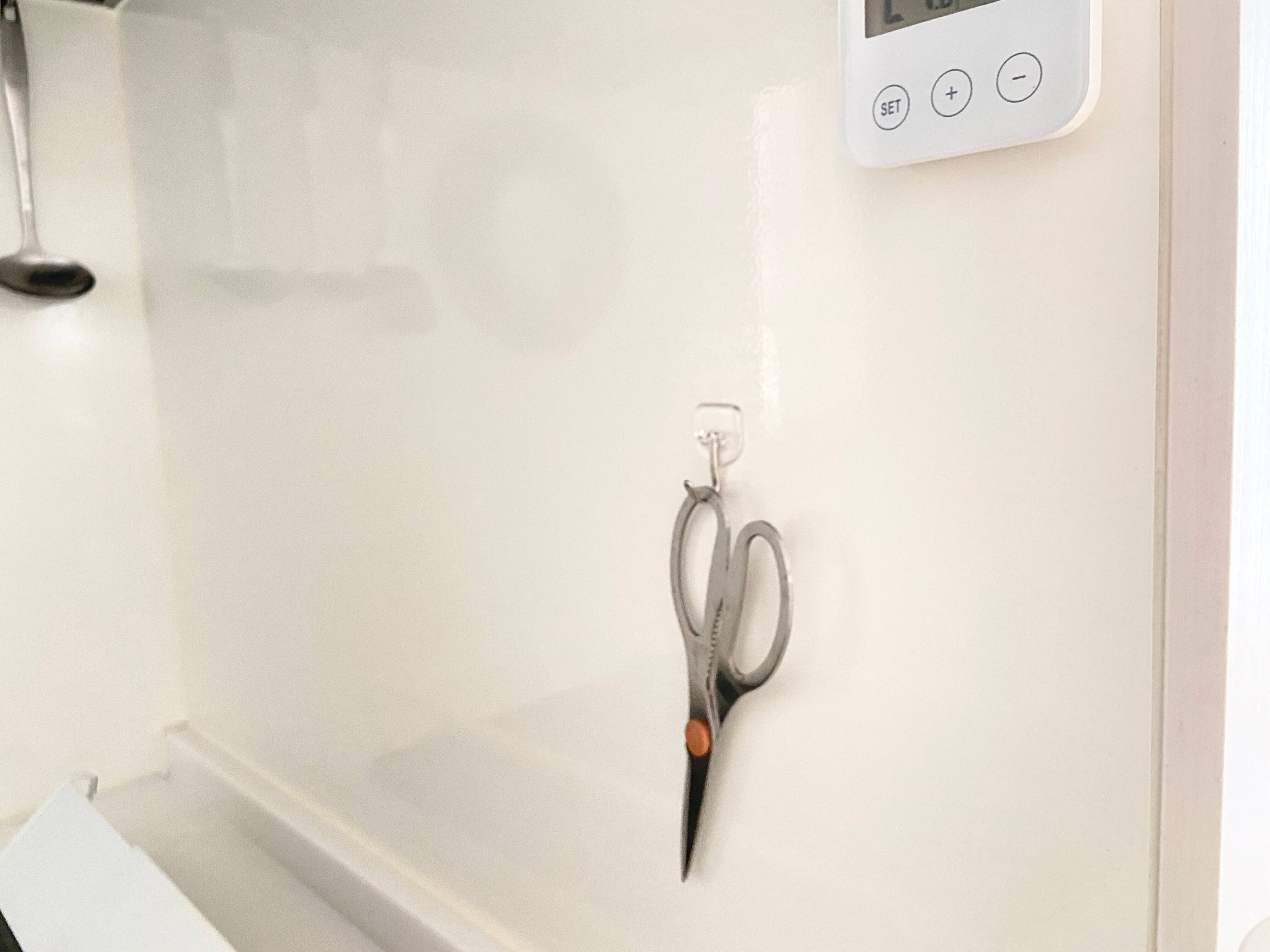 我が家では引き出しを漁るようになった、2歳長男への対策として、キッチンバサミを壁面に浮かし収納するのに使っています。