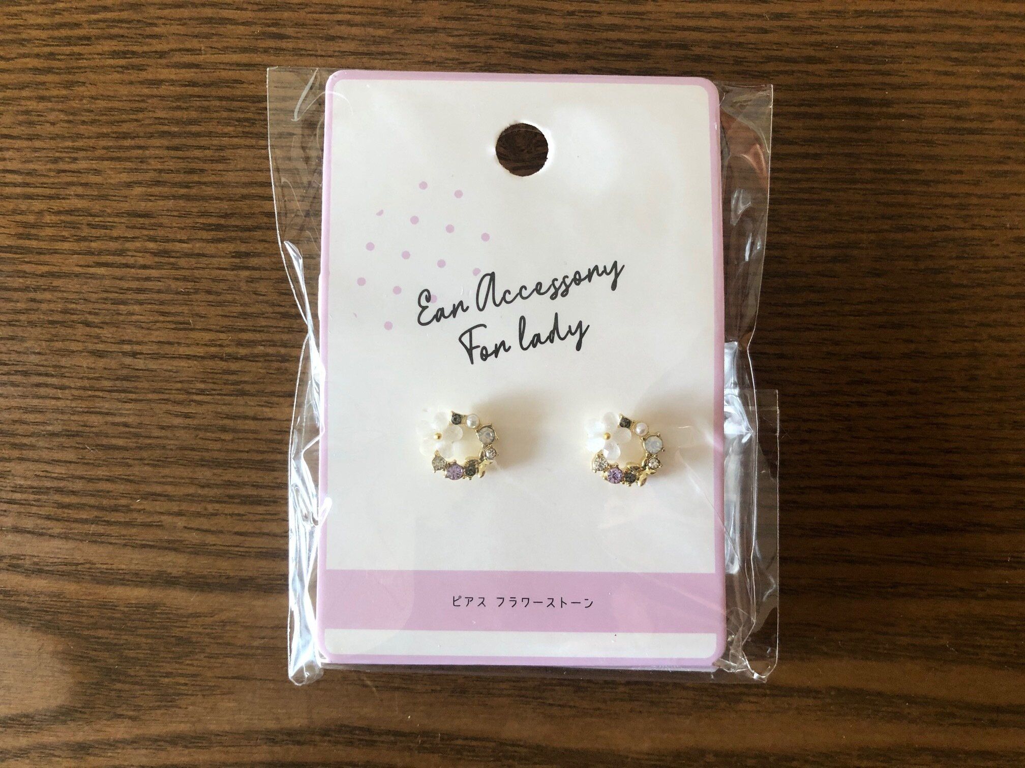 一緒にピアスも買ってしまいました!こちらも、もちろん100円。白いお花とカラフルなビジューが輪になったフラワーストーンピアスです。100円のピアスなんて、大人が着けるようなものではないよね?と思っていた私の意識が根底から覆りました。ものすごく繊細で可愛いですよね。