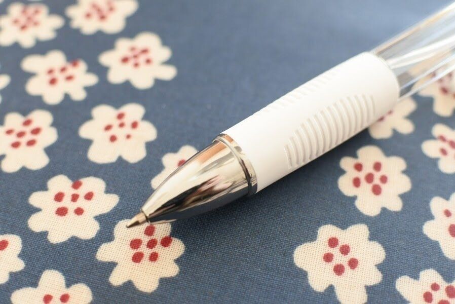 そして、ホワイト部分のグリップを回すとペン先が出てくるようになっています。0.7mmの黒インク(油性)です。