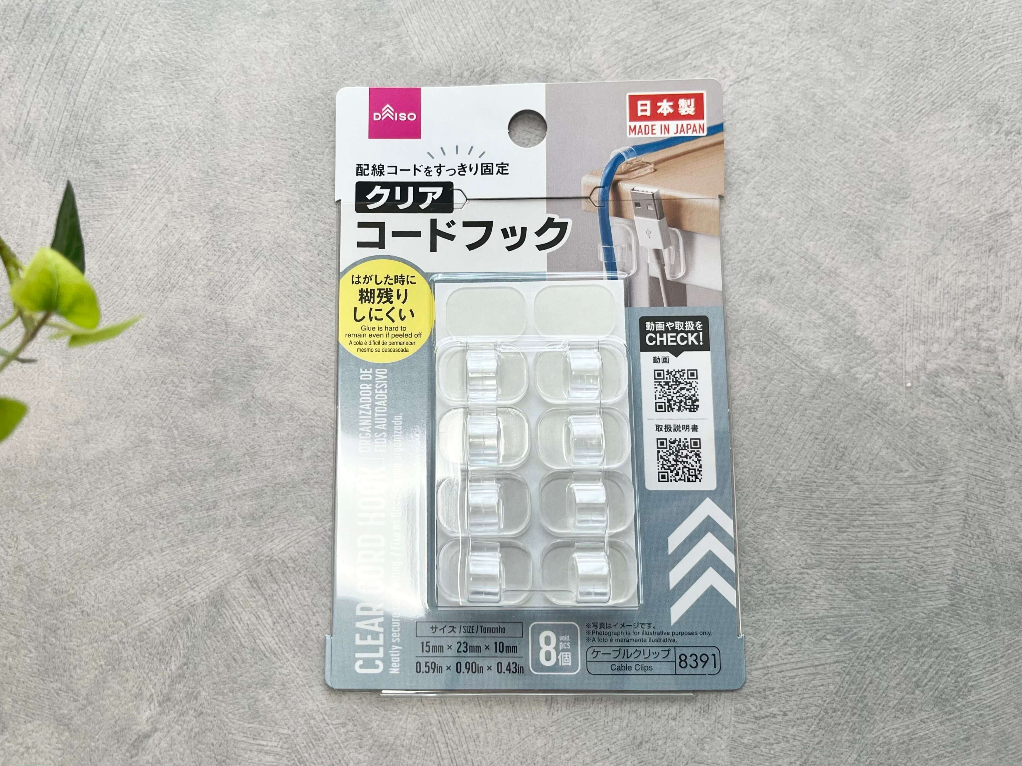 今回はダイソーの「クリアコードフック(8個)」(販売価格:110円)を使用しますが、8個入り〜10個入りで販売されているコードフックであれば他の商品でも代用可能ですので、ぜひ試してみてください。