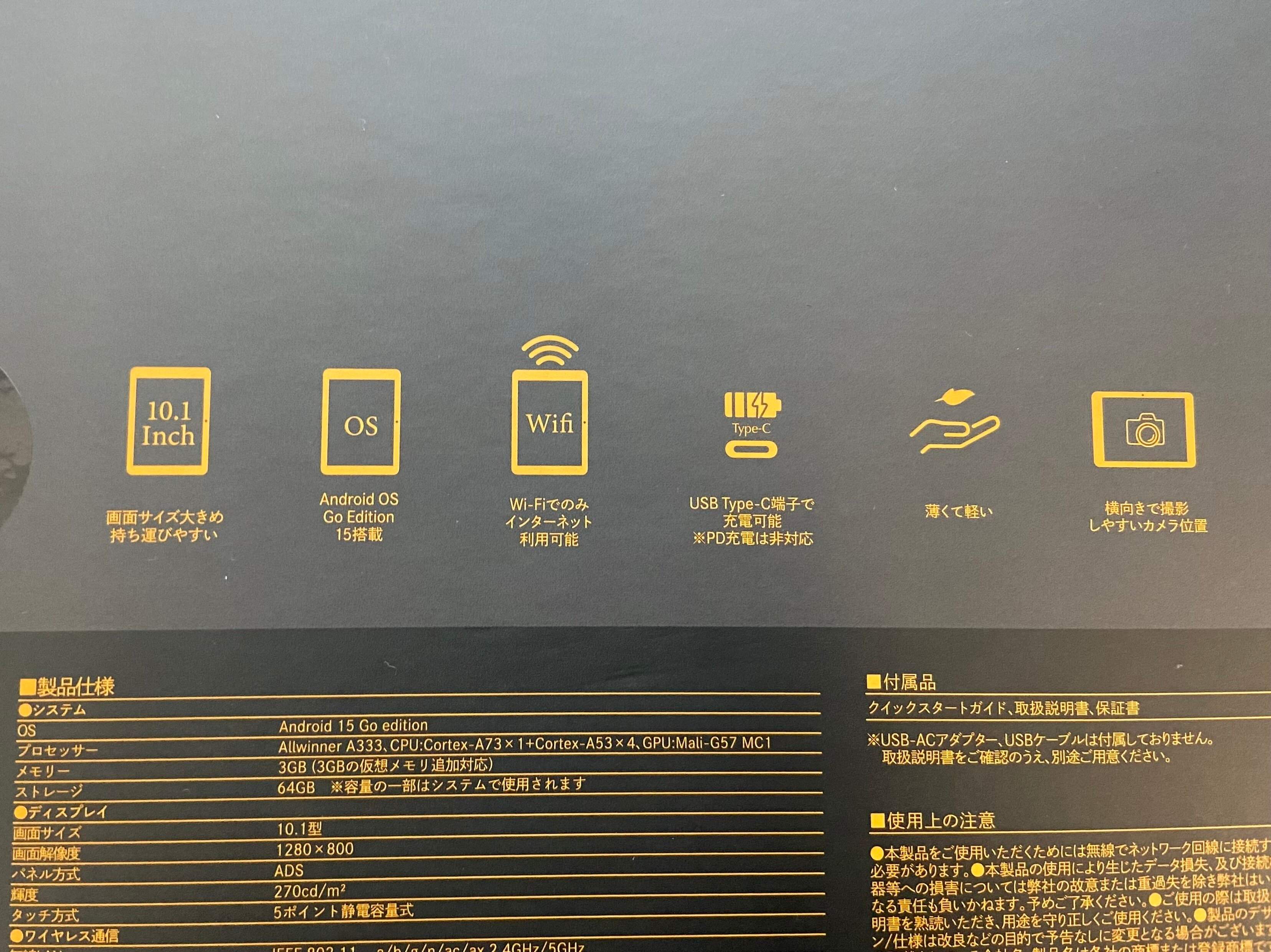 「10.1インチタブレット」は、初心者やサブタブレットとして使用するのにぴったり。Android 15 GO Editionを搭載していて、基本的な機能は備わっています。