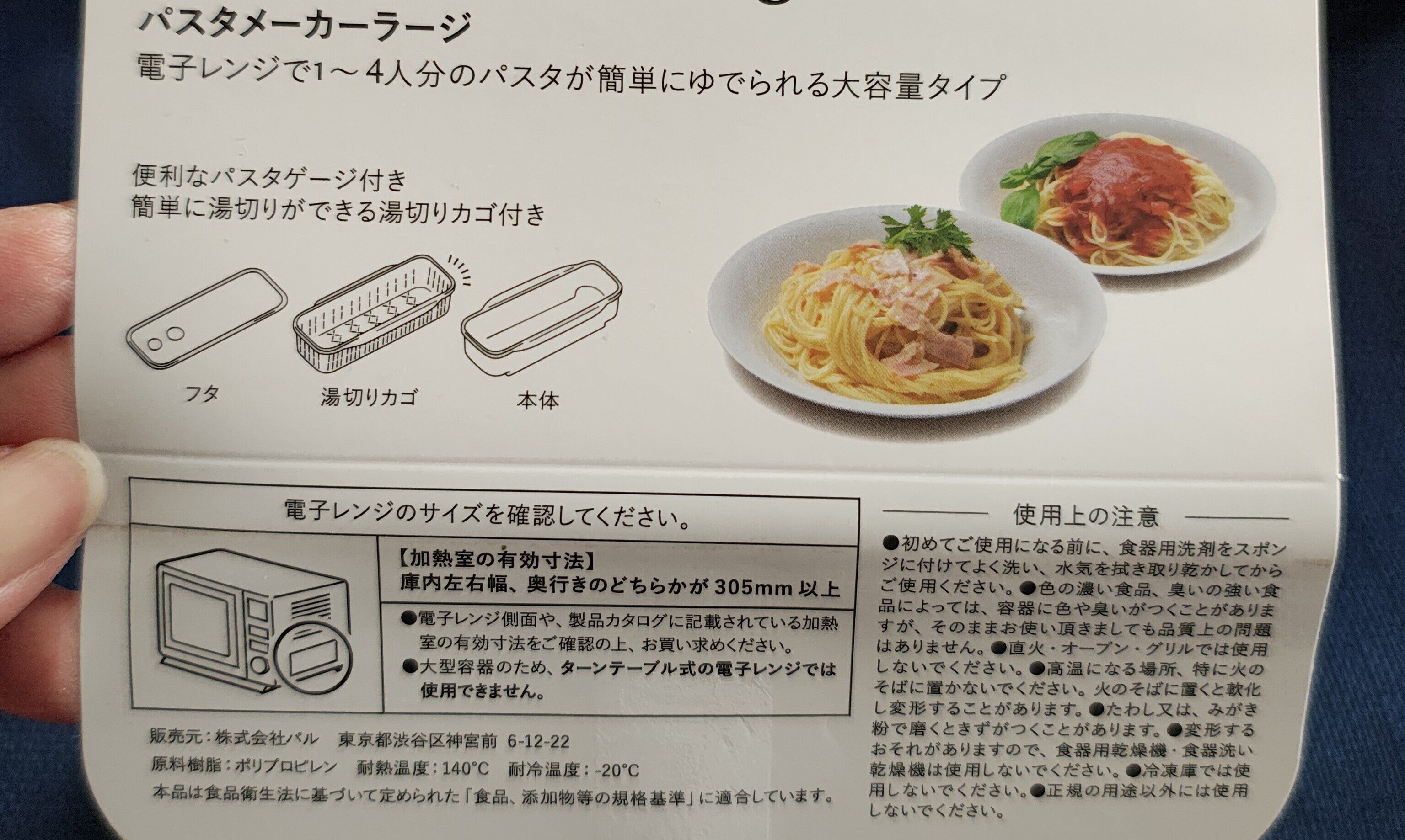 スリコの「パスタメーカーラージ」は、サイズが大きめ。購入する前に電子レンジの庫内の大きさを確認するのをおすすめします。電子レンジの庫内の左右幅または奥行きのどちらかが30.5cm以上ないといけないようです。