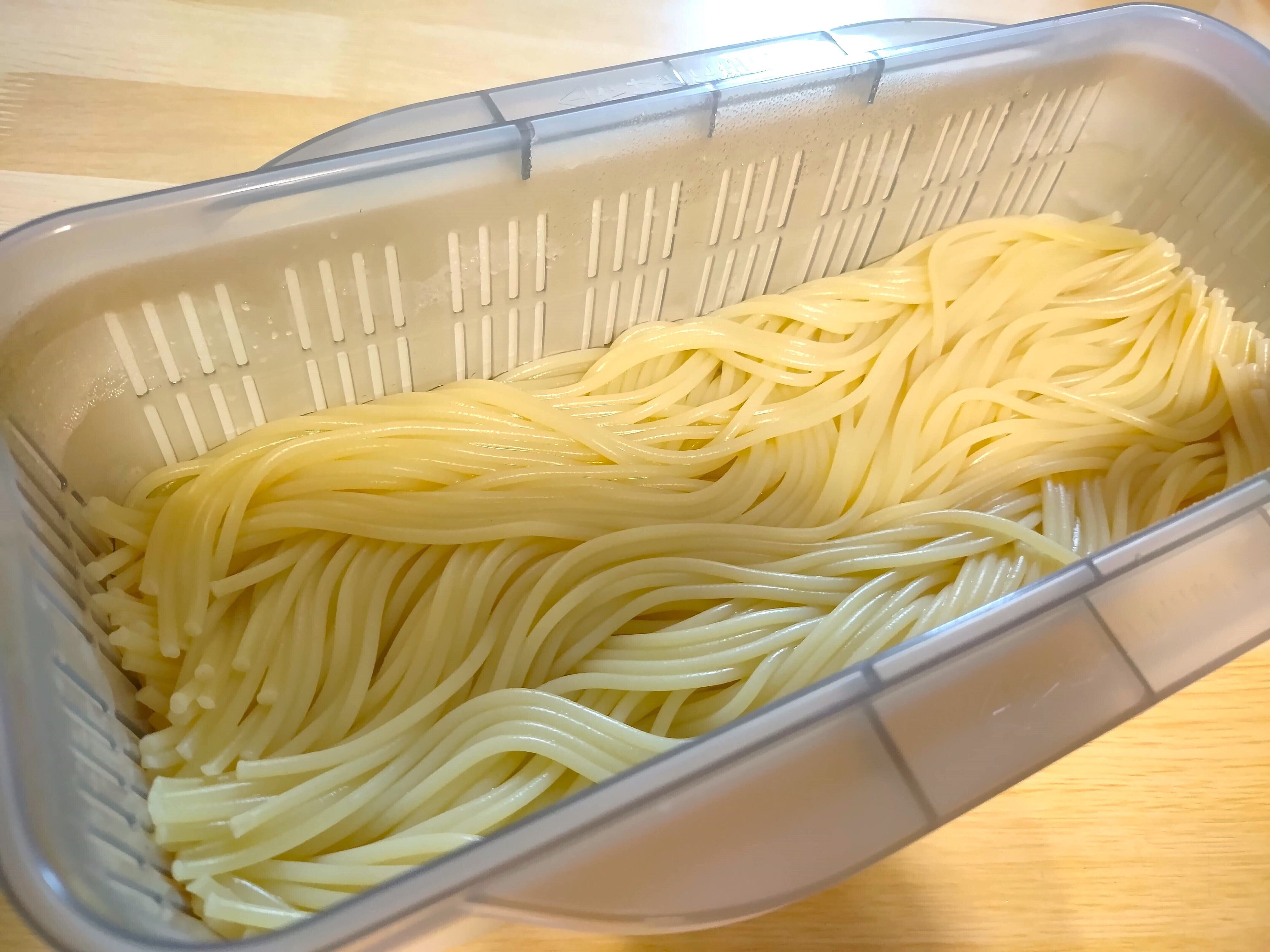 早速作ってみたのですが、麺がまったくくっついていません。一度もかき混ぜていないのに不思議です…。お湯を捨てたらお好きなパスタソースでいただきます。