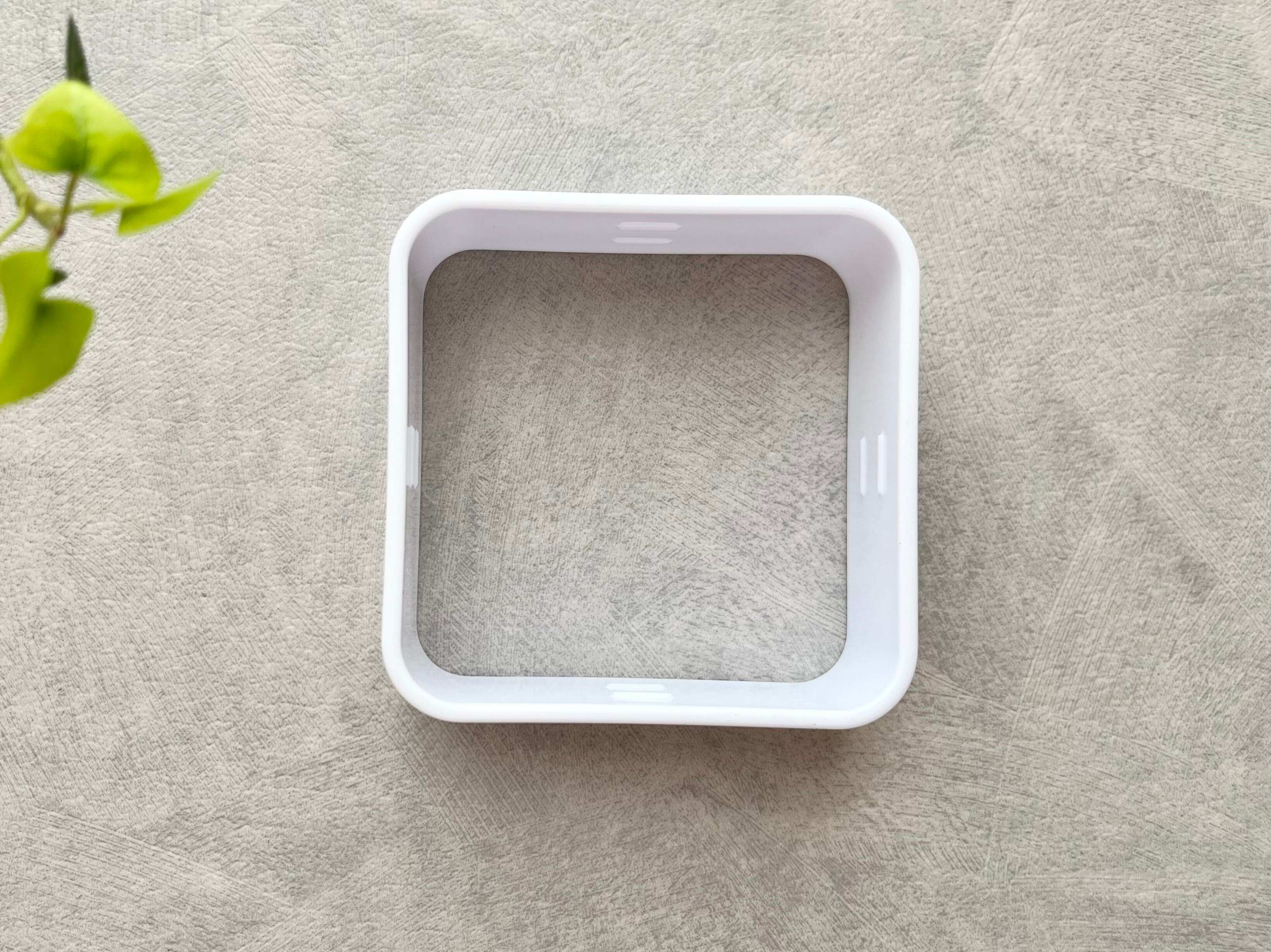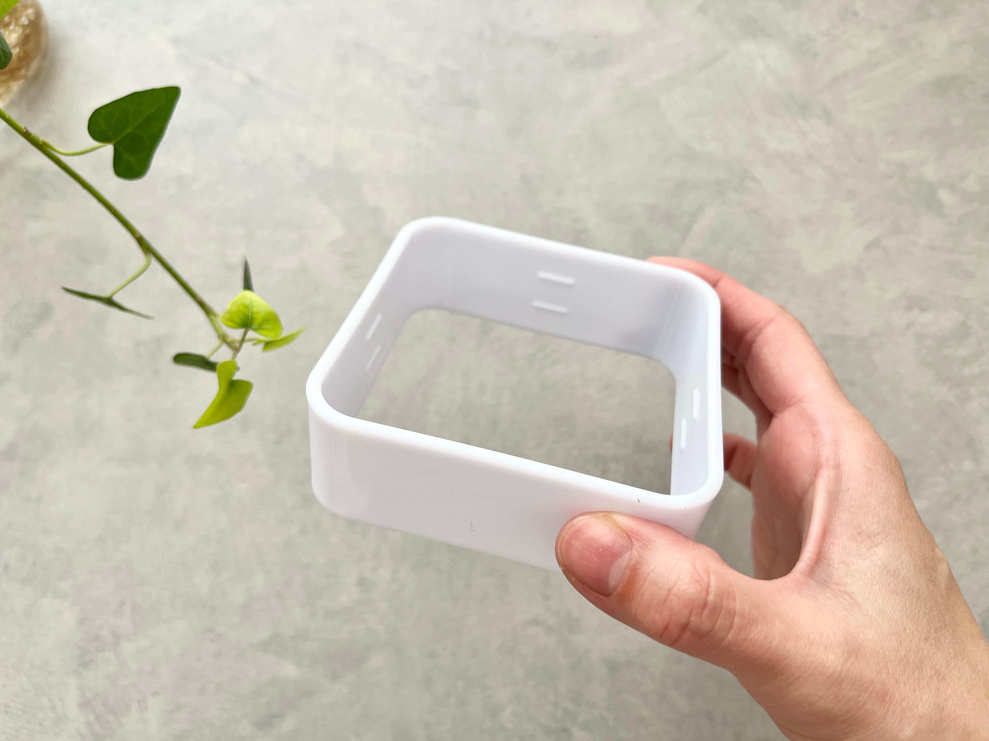 商品のサイズは、約8.5cm×8.5cm×3cm。中央が空いた四角い輪っかのような形をしています。