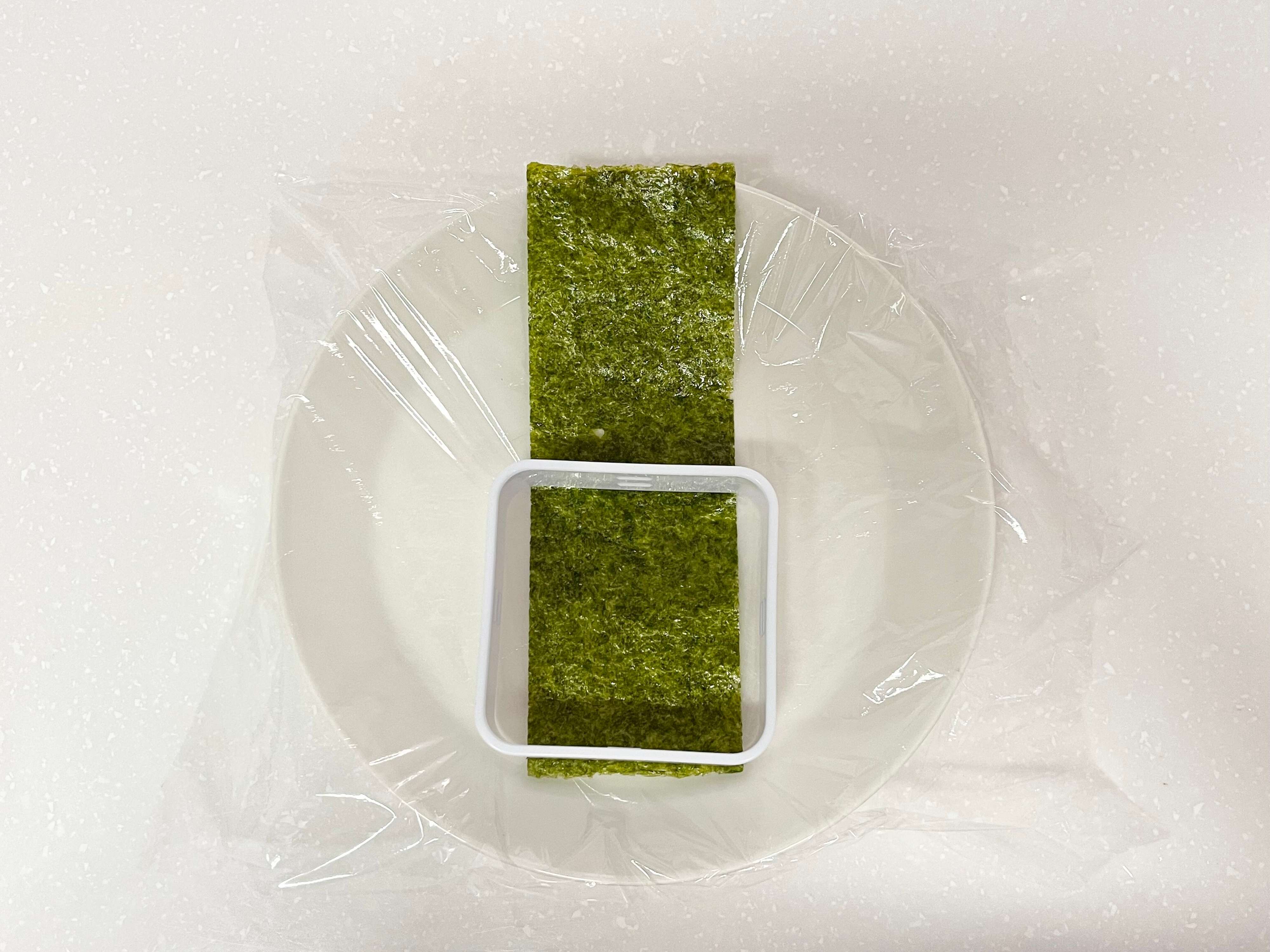 作り方はとっても簡単!まず2切サイズの海苔を用意します。そして、海苔の端の方に「おにぎりサンドメーカー」を置きます。