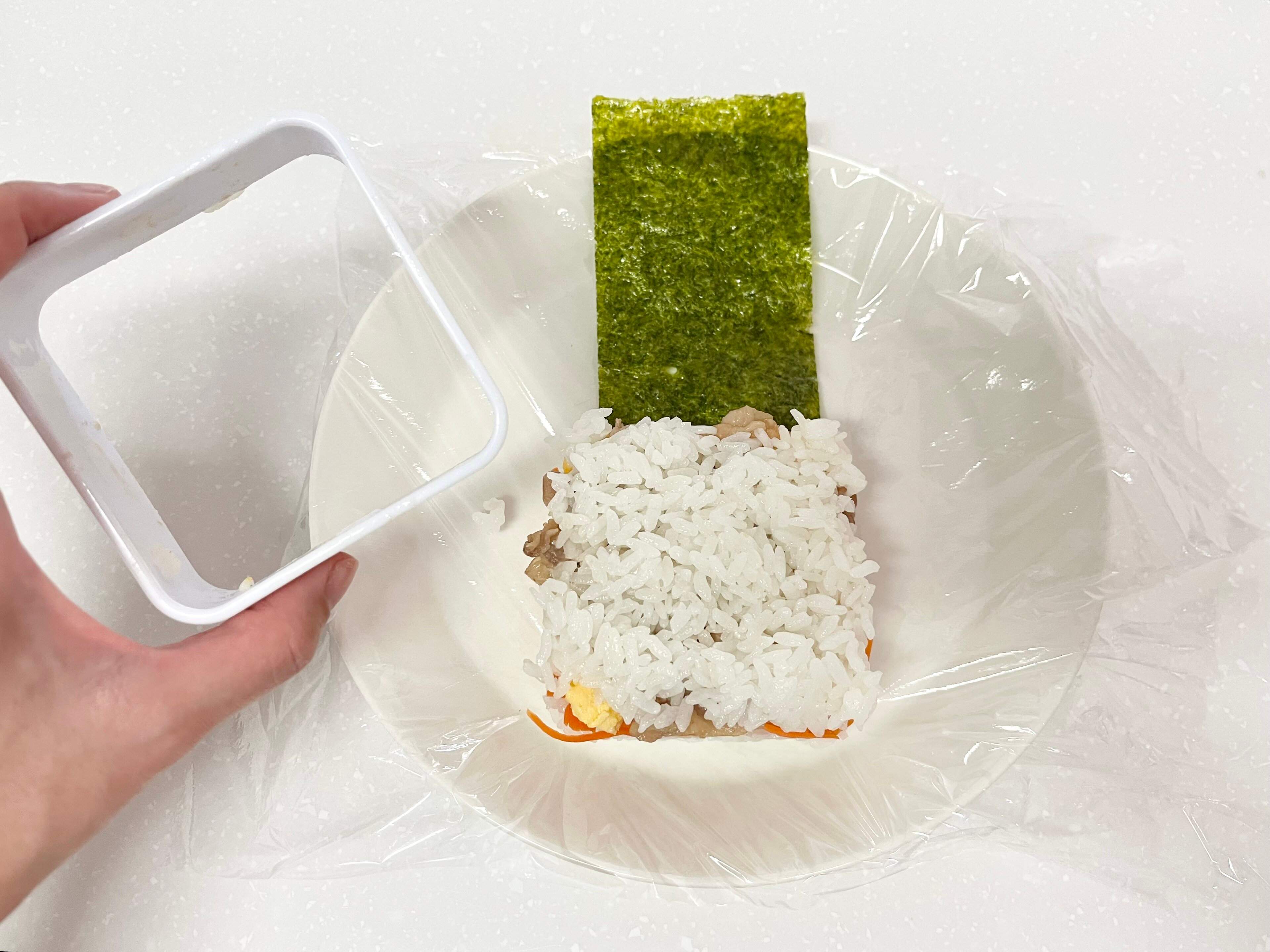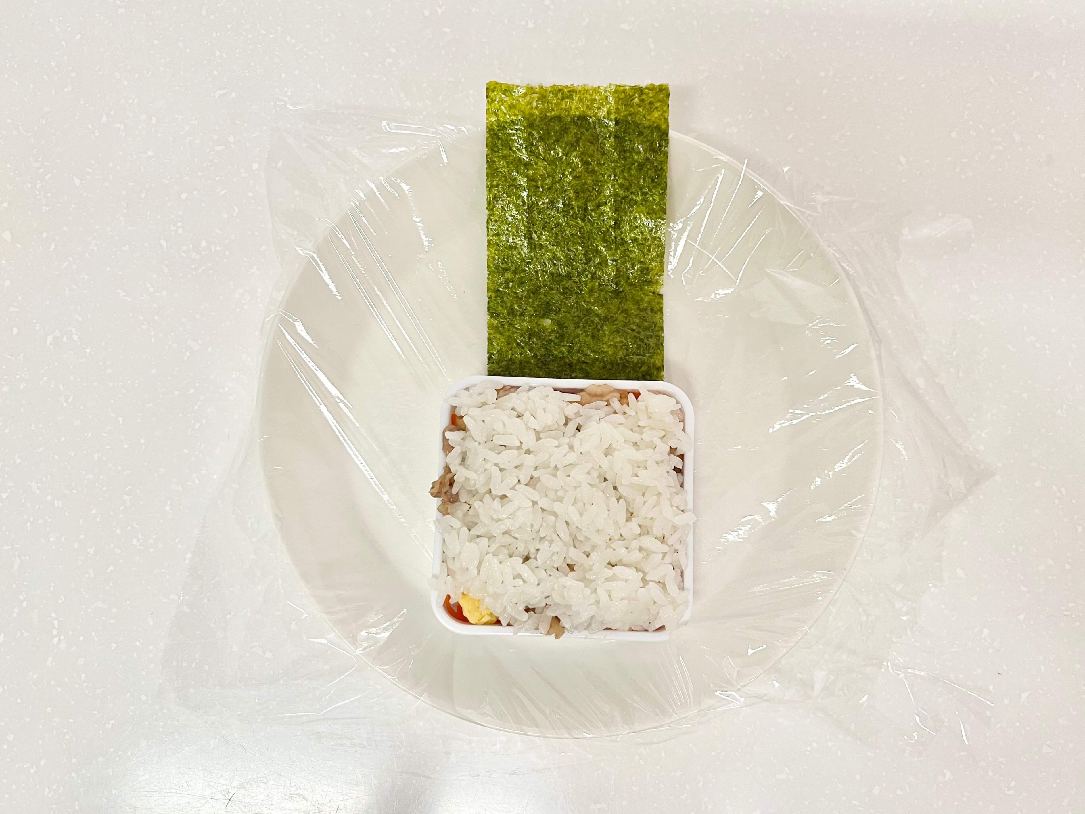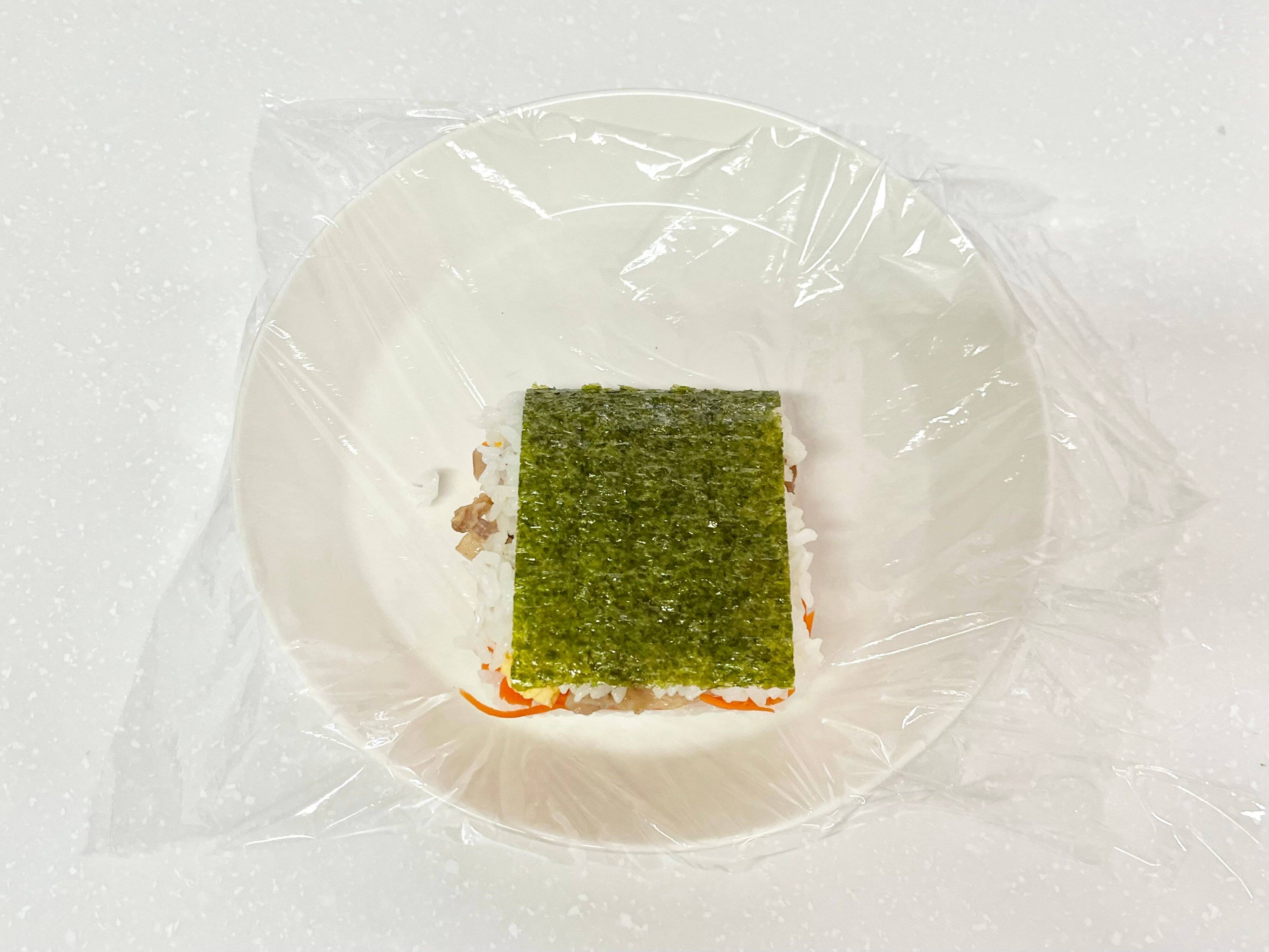 最後に、ご飯と具材が乗っていない側の海苔を被せたら、おにぎりサンドの完成です。