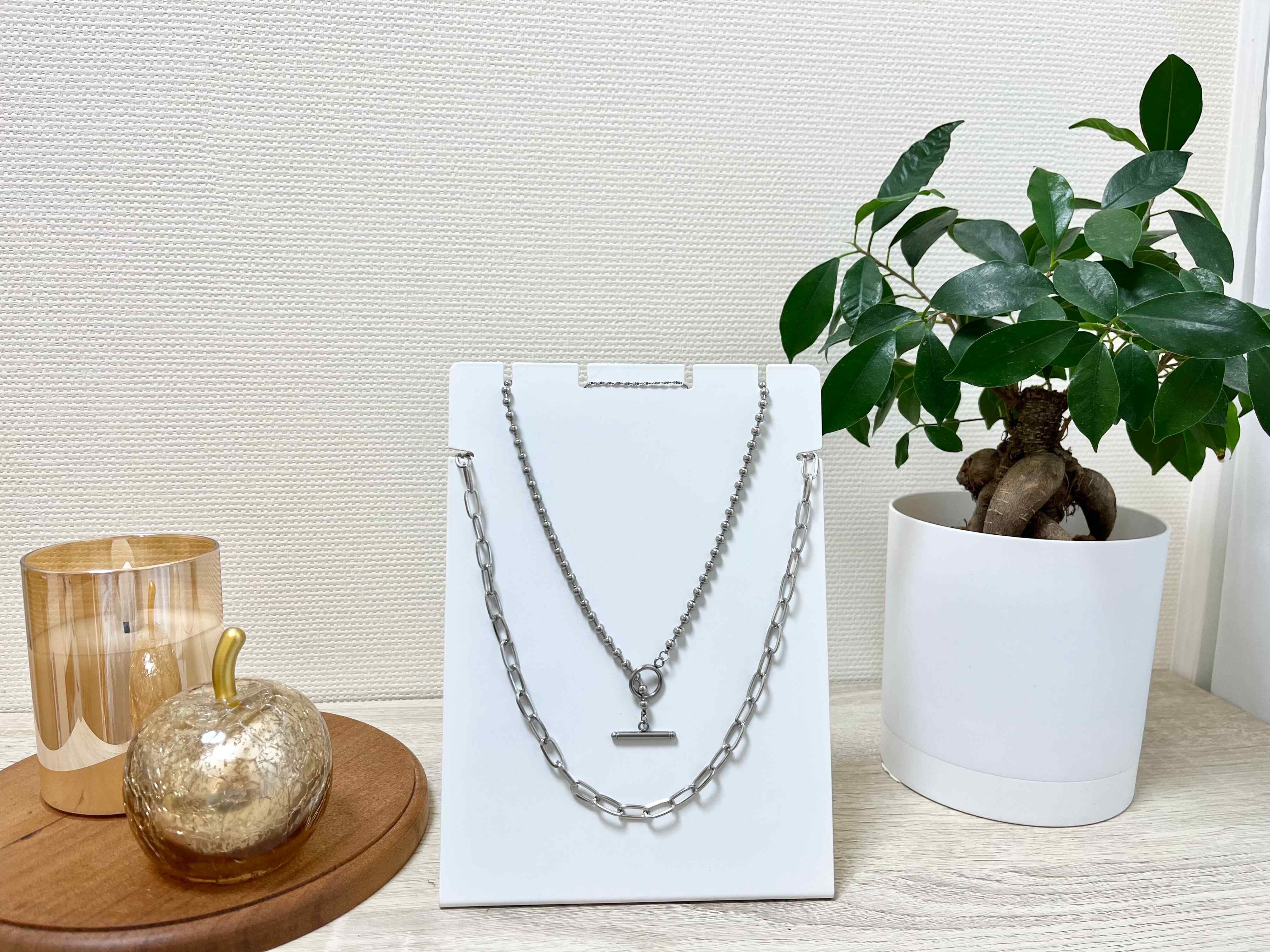 切り込みの幅は4mmぐらいあるので、ある程度の太さのあるネックレスでもかけることができます。段差違いでかけられるので、ただかけるだけなのにバランスよく、まるでお店のようにオシャレにネックレスを見せながら収納することができますよ。