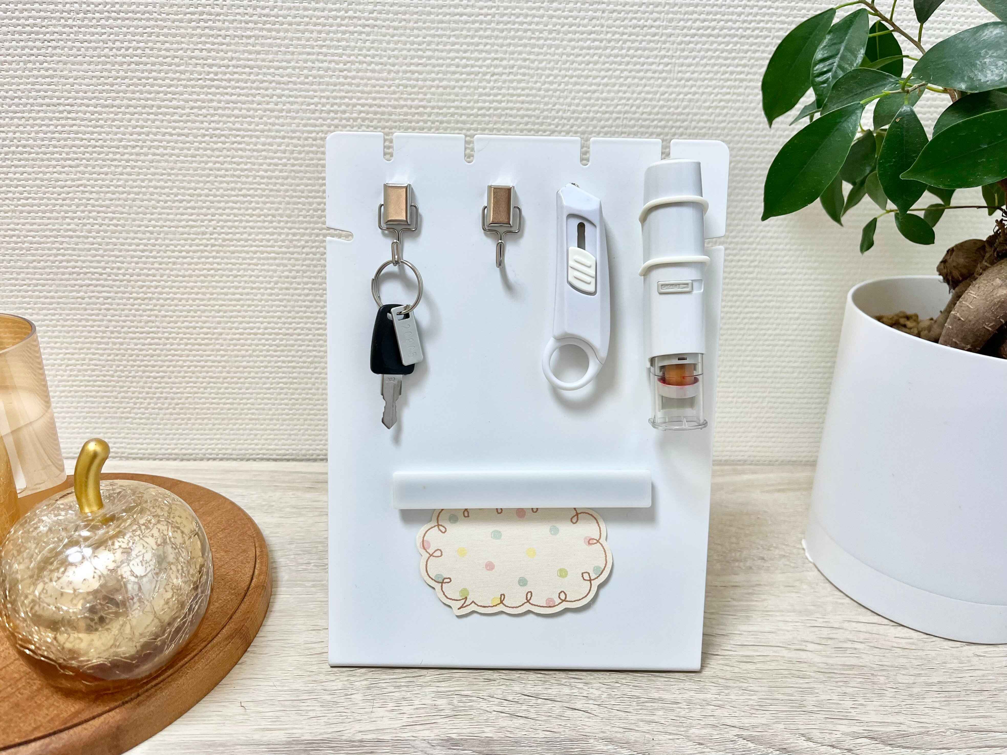 さらに、高さがあるので下の余白の部分には、連絡メモなどを貼ることも可能!玄関先でよく使うごちゃごちゃしがちな小物類を、スッキリまとめて収納できるのでとっても便利なんですよ。