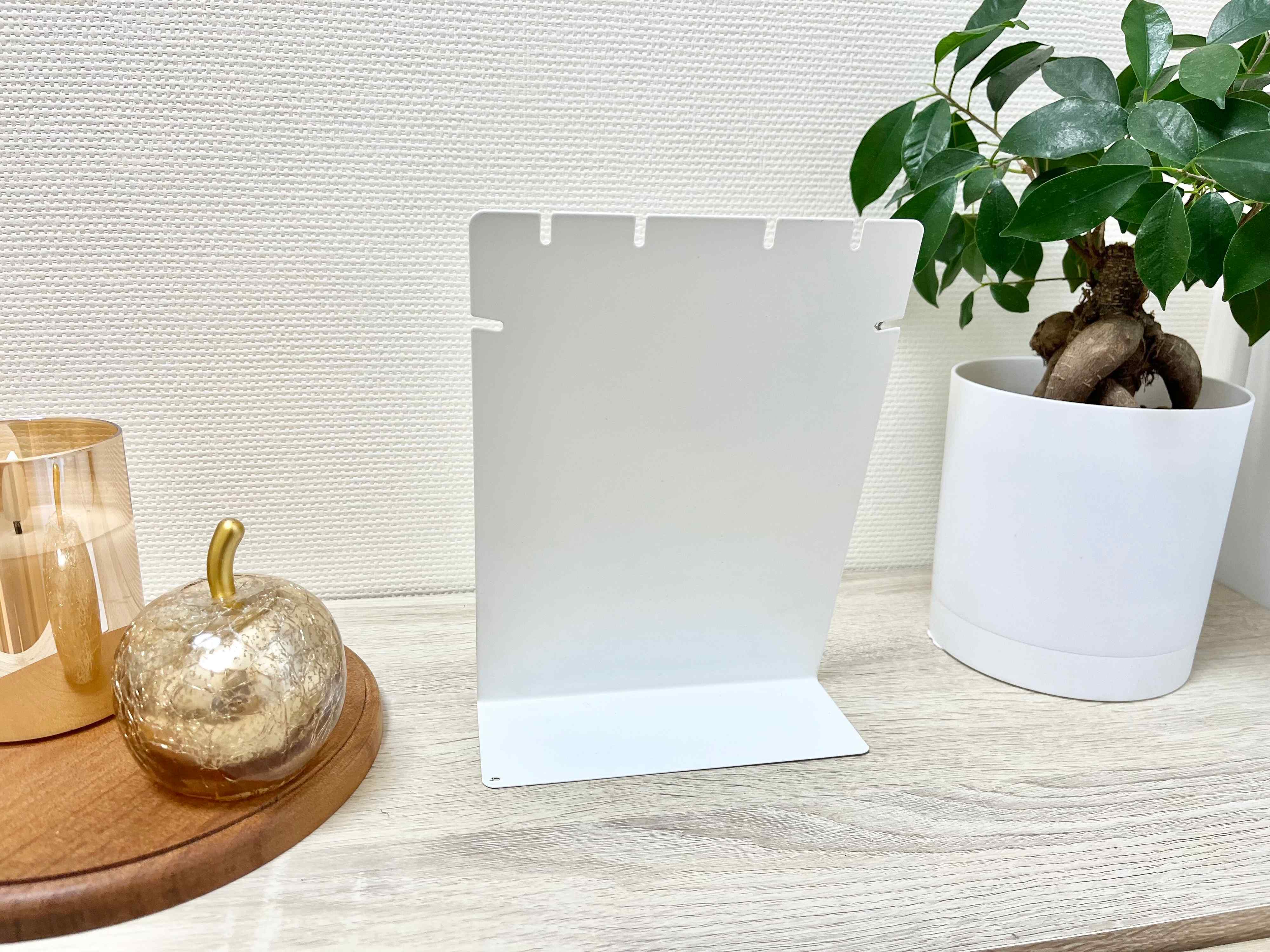商品のサイズは、約15cm×20cm×6cm。素材はスチール製で、マットなホワイトカラーなので220円とは思えないぐらい高見えします。上部には6ヵ所に切り込みがあり、この切り込みにネックレスをかけて使用します。