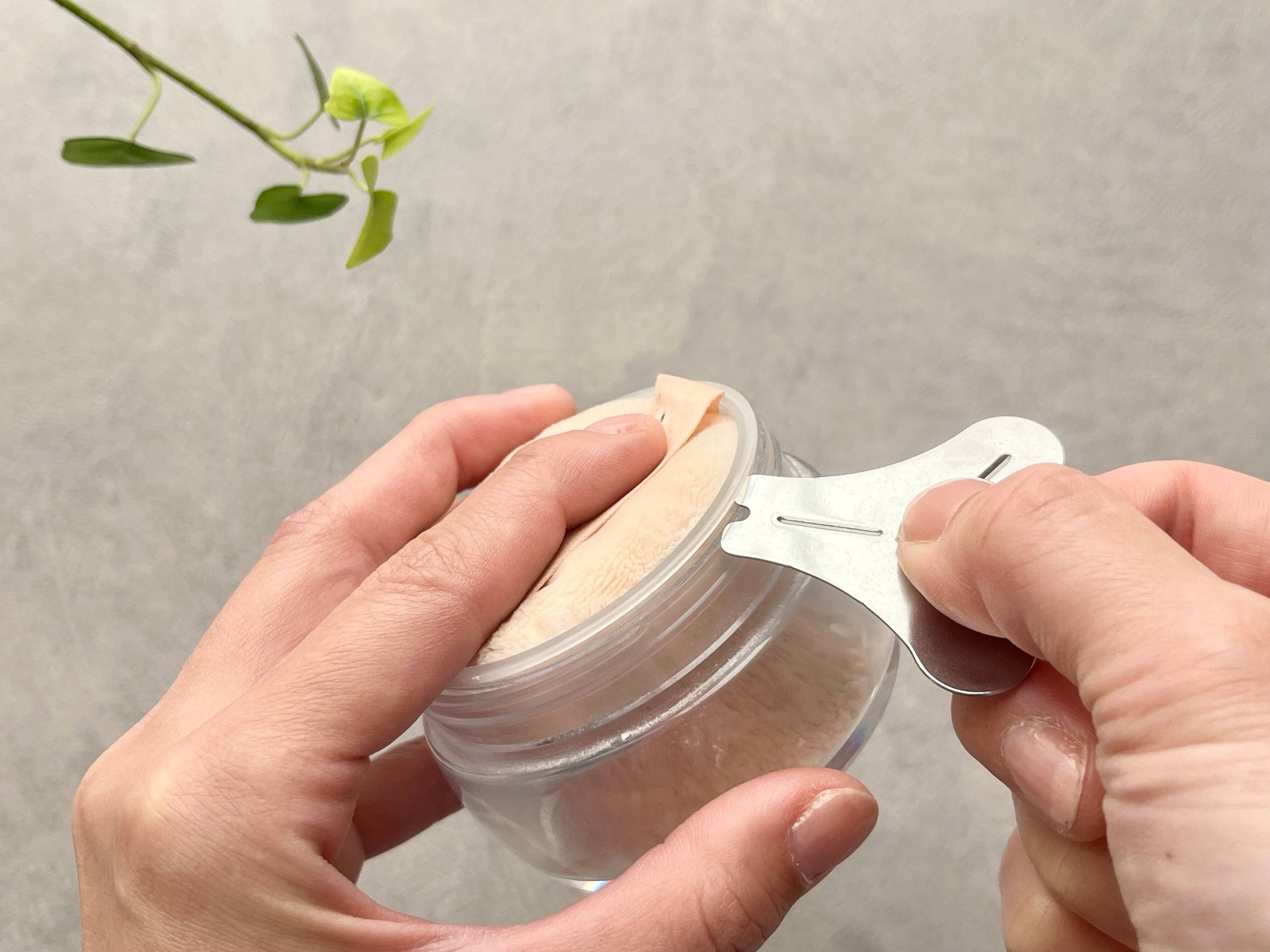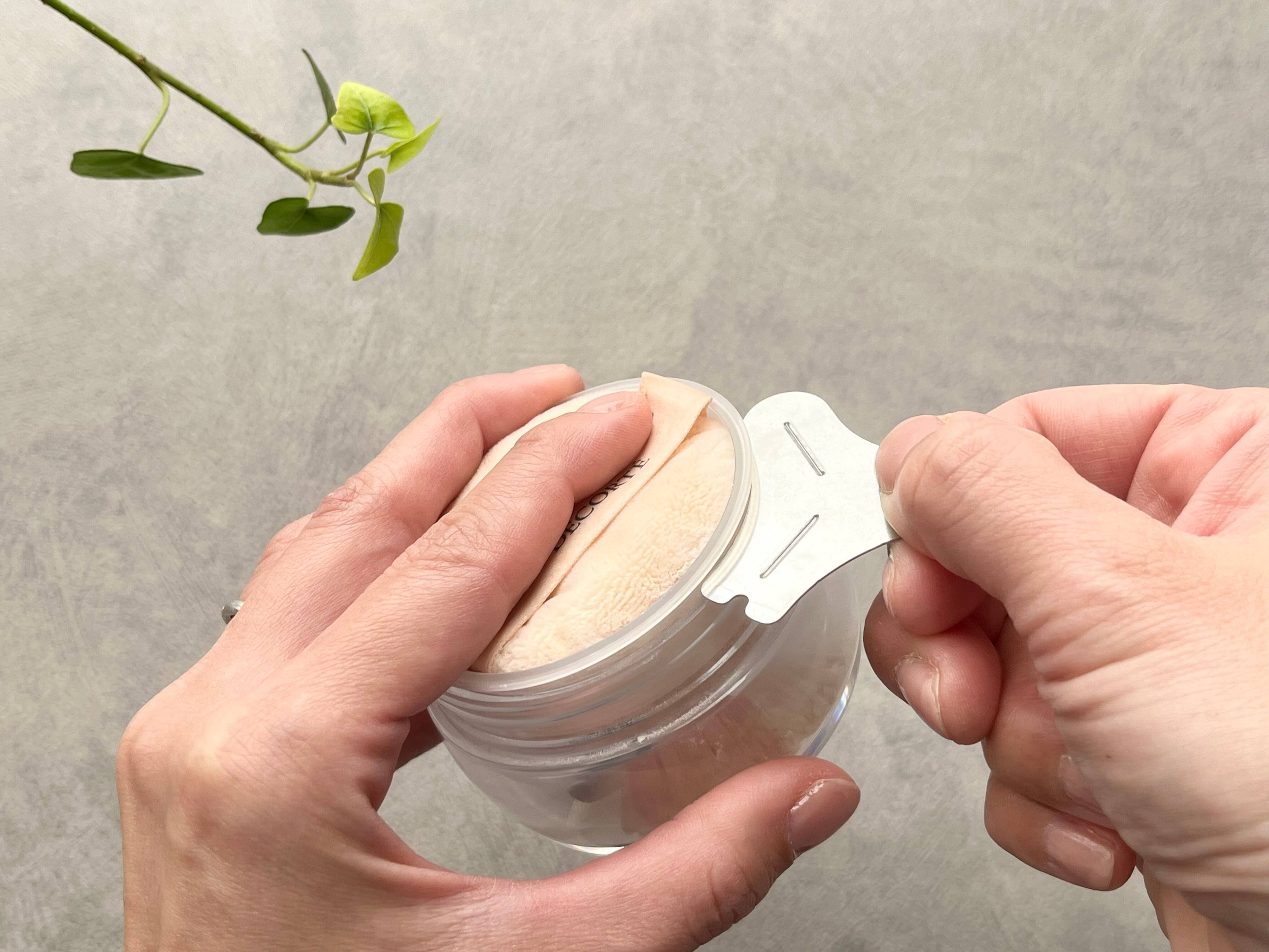 使い方はとっても簡単!二股の先端を容器と内蓋の間に差し込み、上下に軽くねじります。パウダーが舞わないように、パフは乗せた状態で作業します。