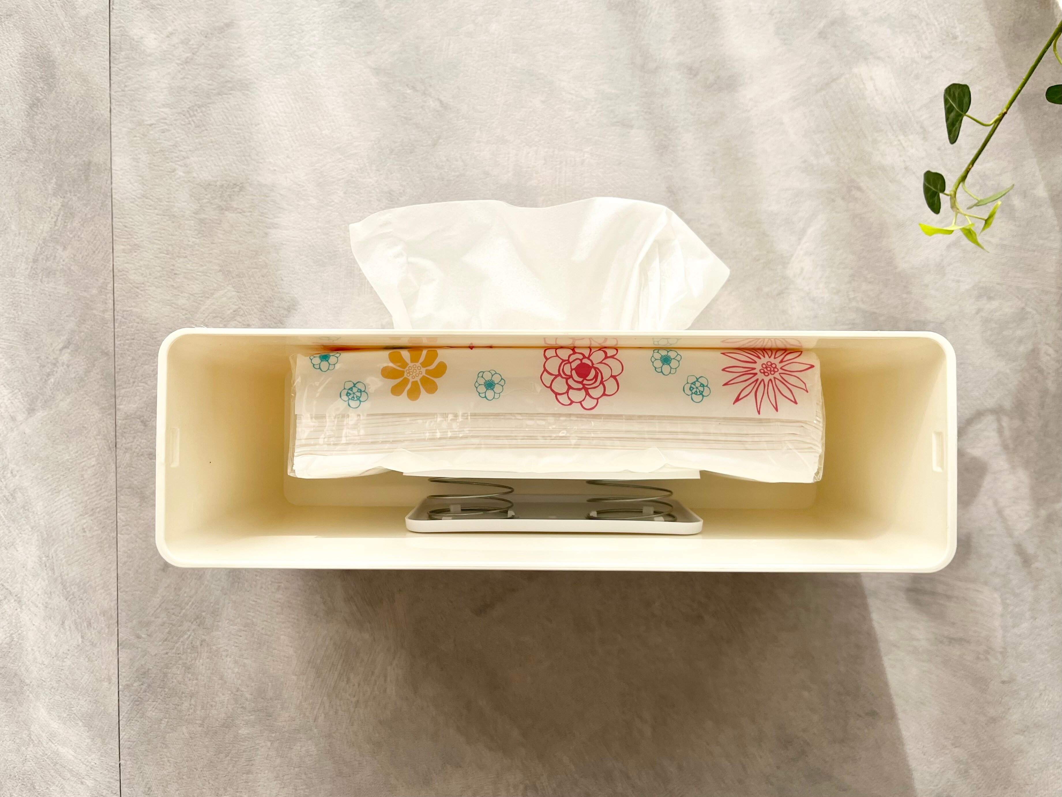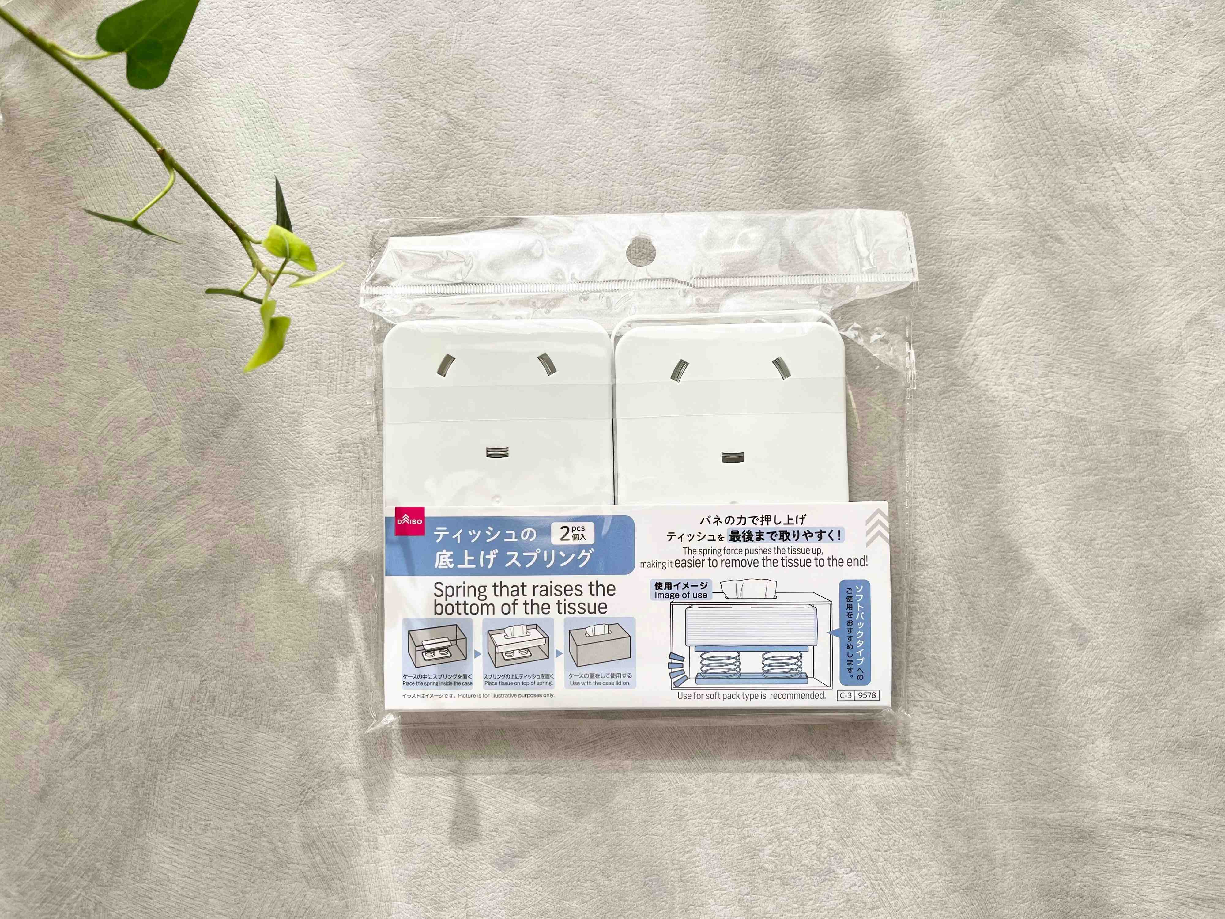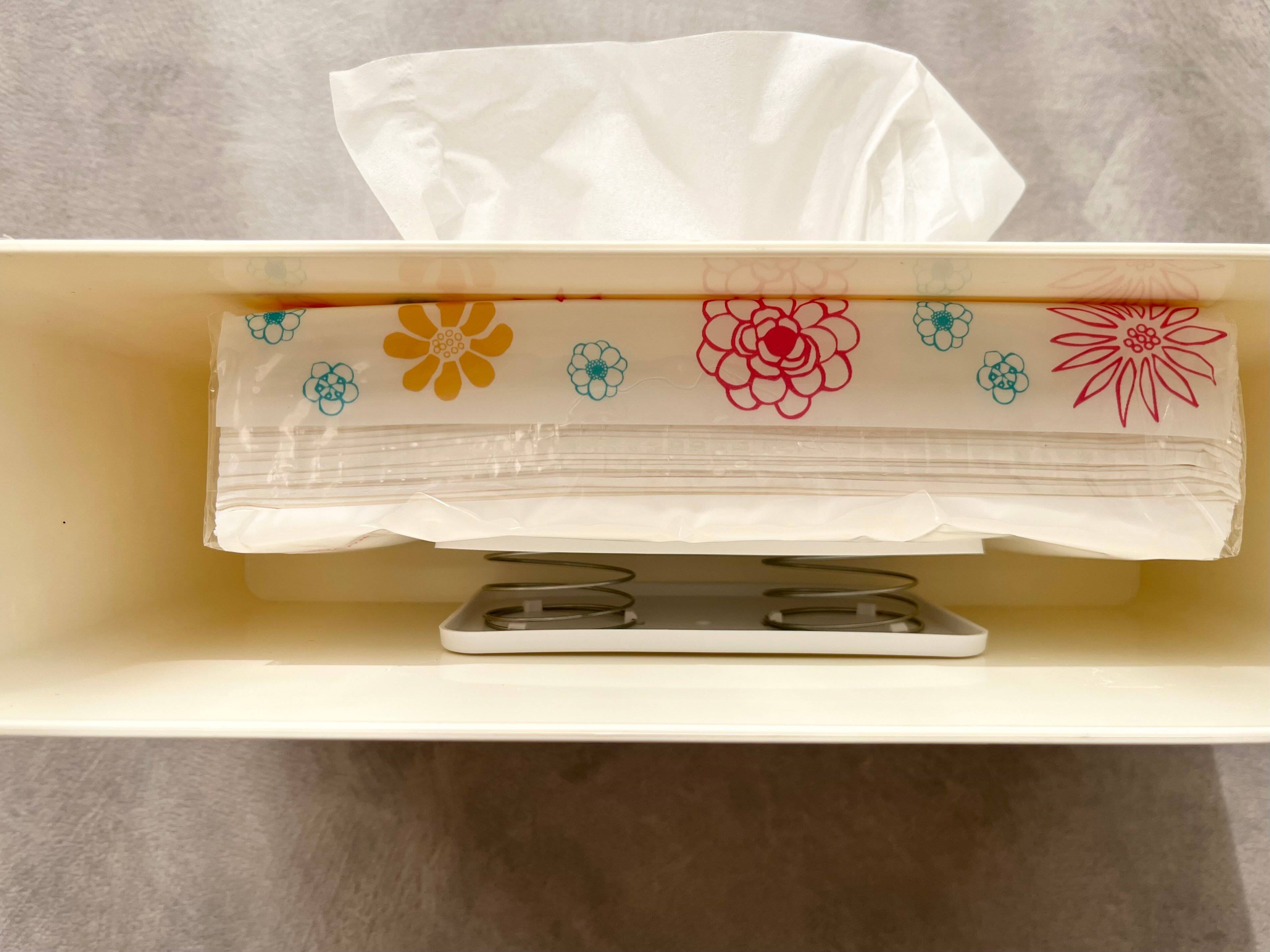 ダイソーの「底上げスプリングホルダー」を使えば、ティッシュの取り出しやすさが格段に変わります。バネの力も強めなので、最後の1枚までノンストレスで取り出すことができます。しかも2個入りなので1個55円というコスパの良さも魅力的ですよね?これ考えた人、本当に天才すぎる!