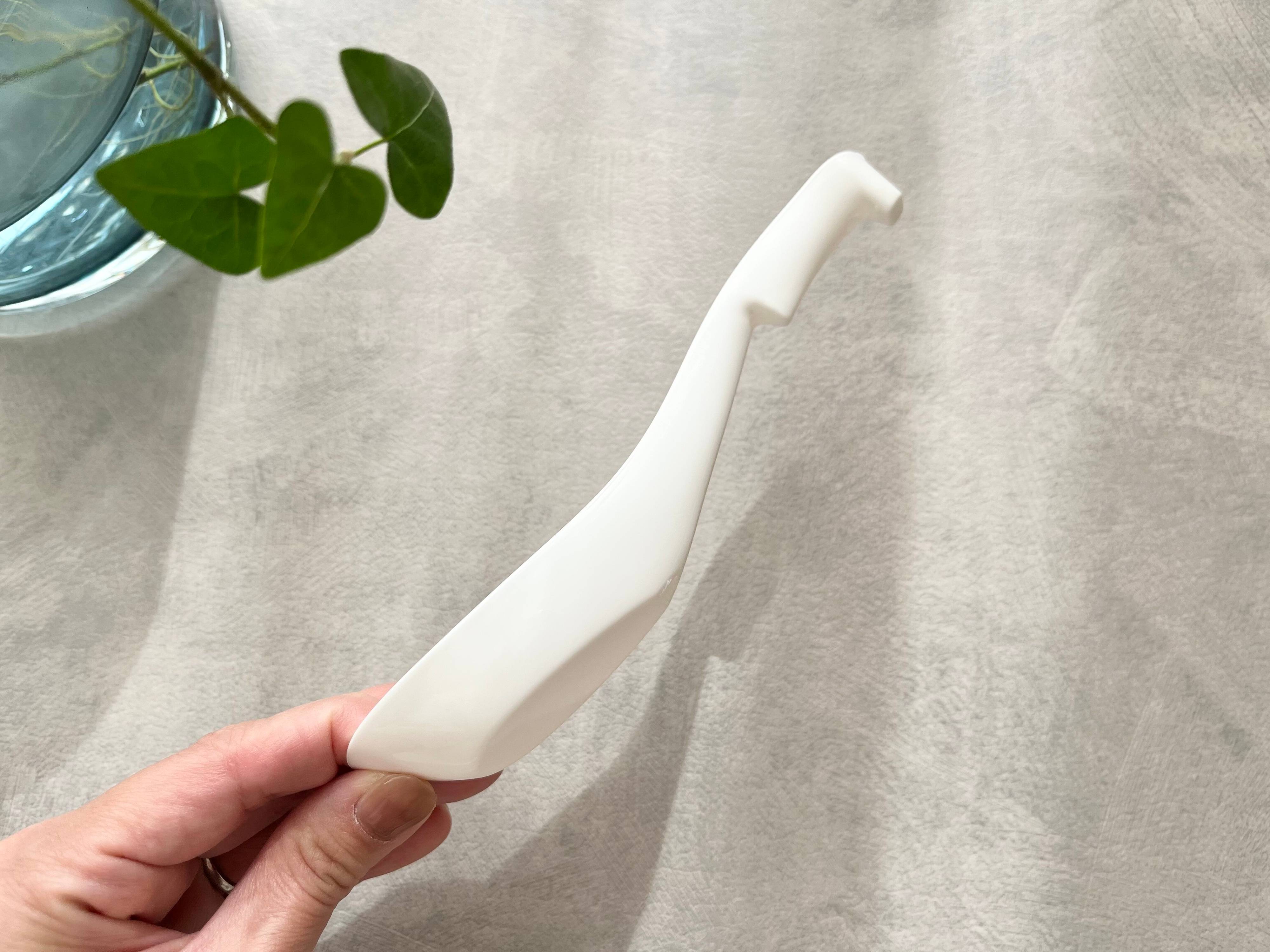 このフックをどんぶりのフチに引っかけることで、レンゲがすべってスープにドボンと入ってしまうのを防ぐことができるという仕組みなんですよ。
