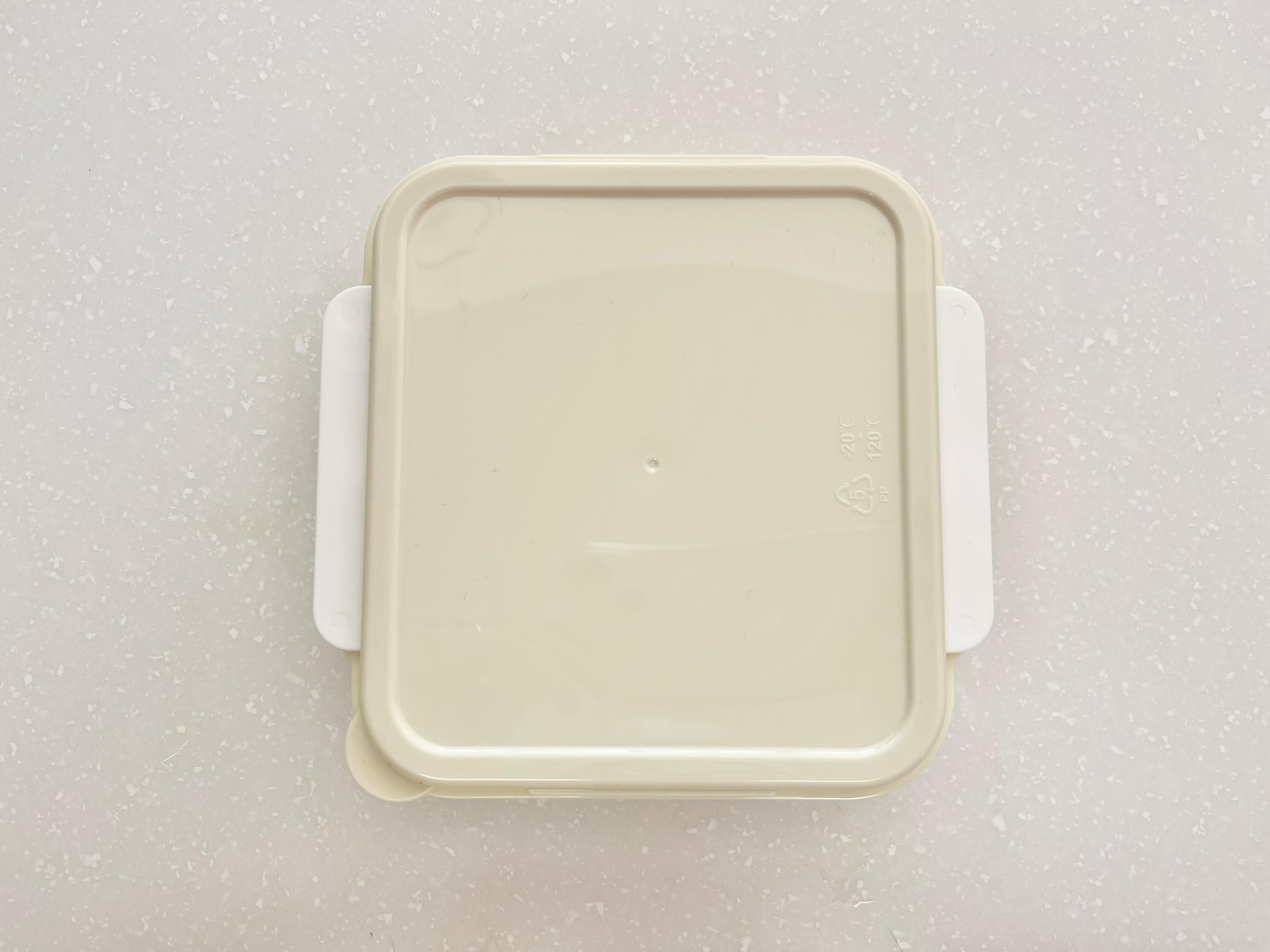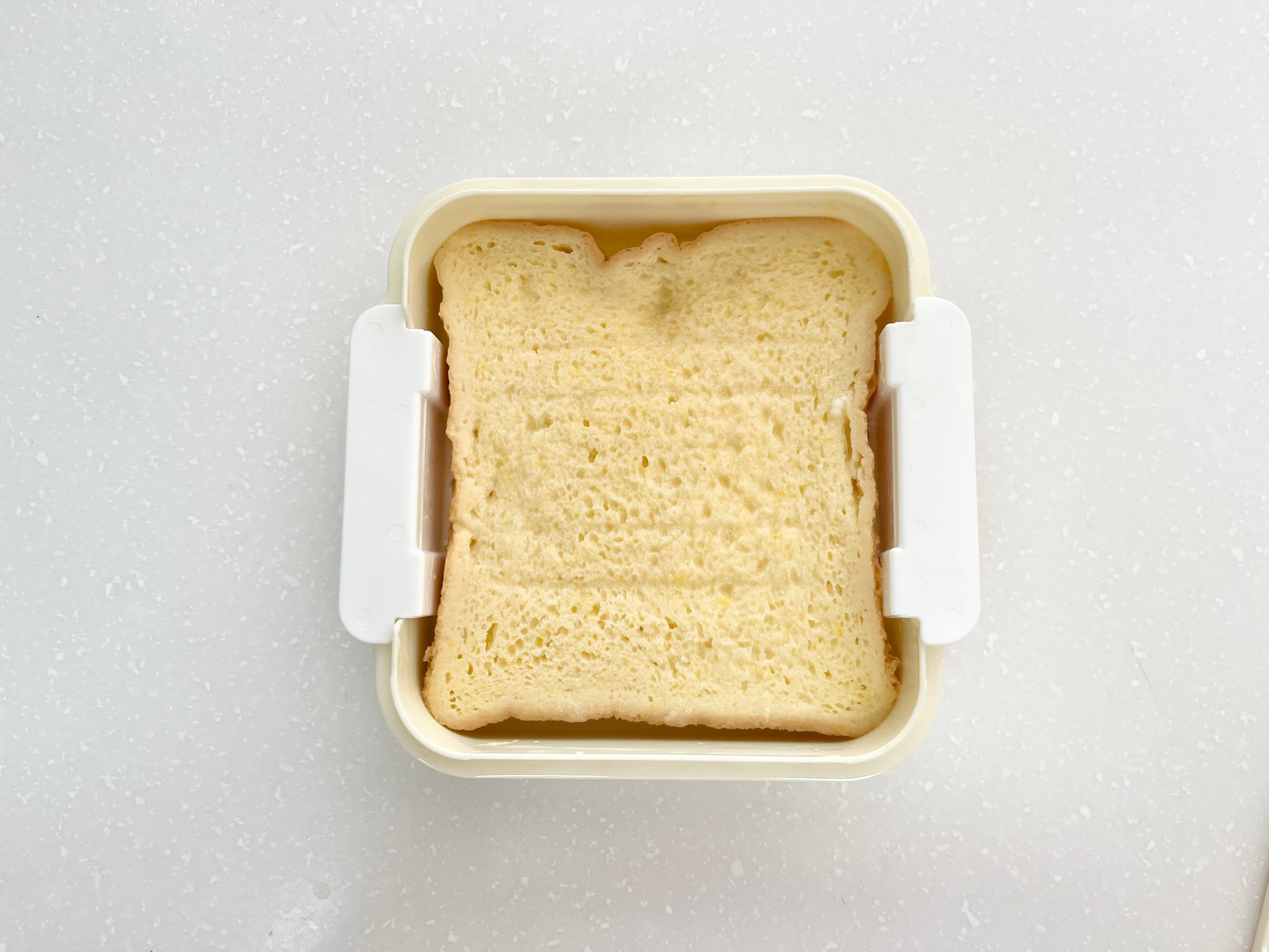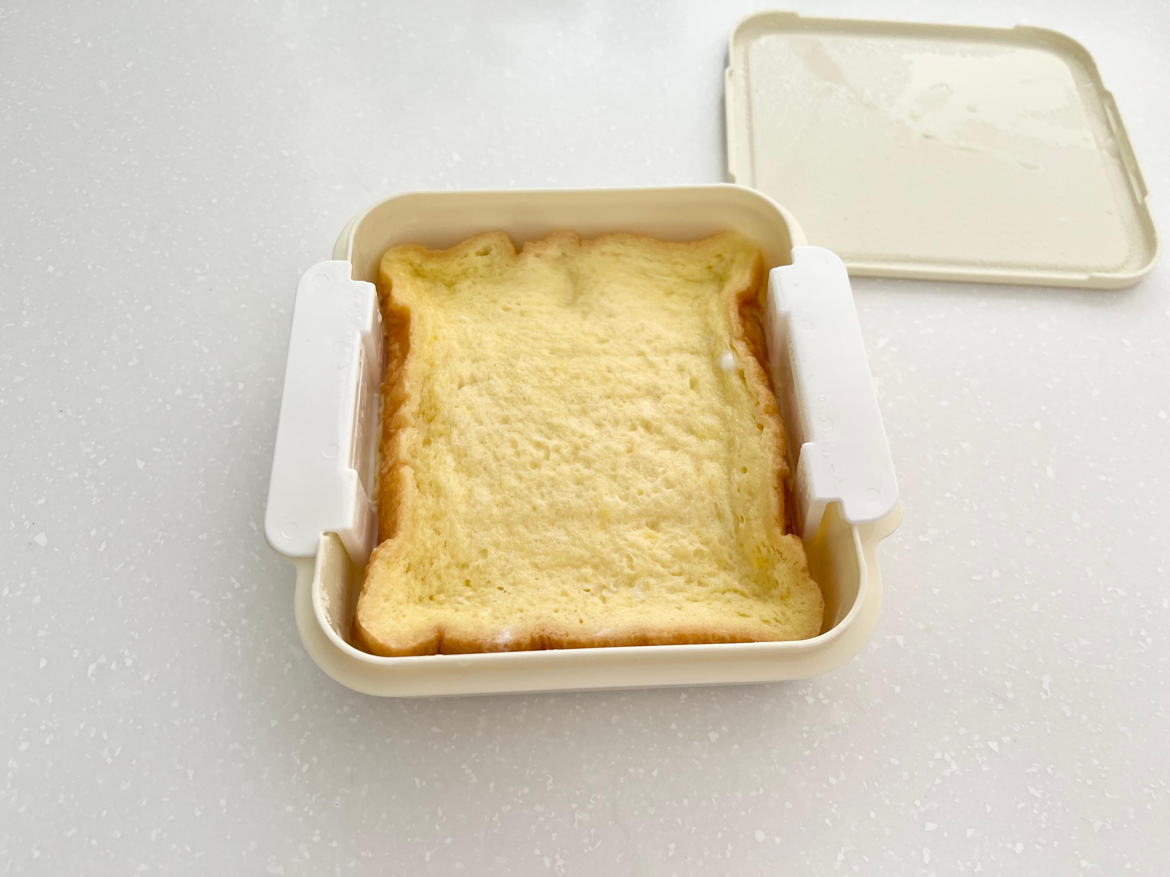 次は容器にバスケット、食パンの順にセットします。食パンは4枚切りから6枚切りのものが使用可能。そして蓋をしてから、冷蔵庫で20分ほど寝かせます。