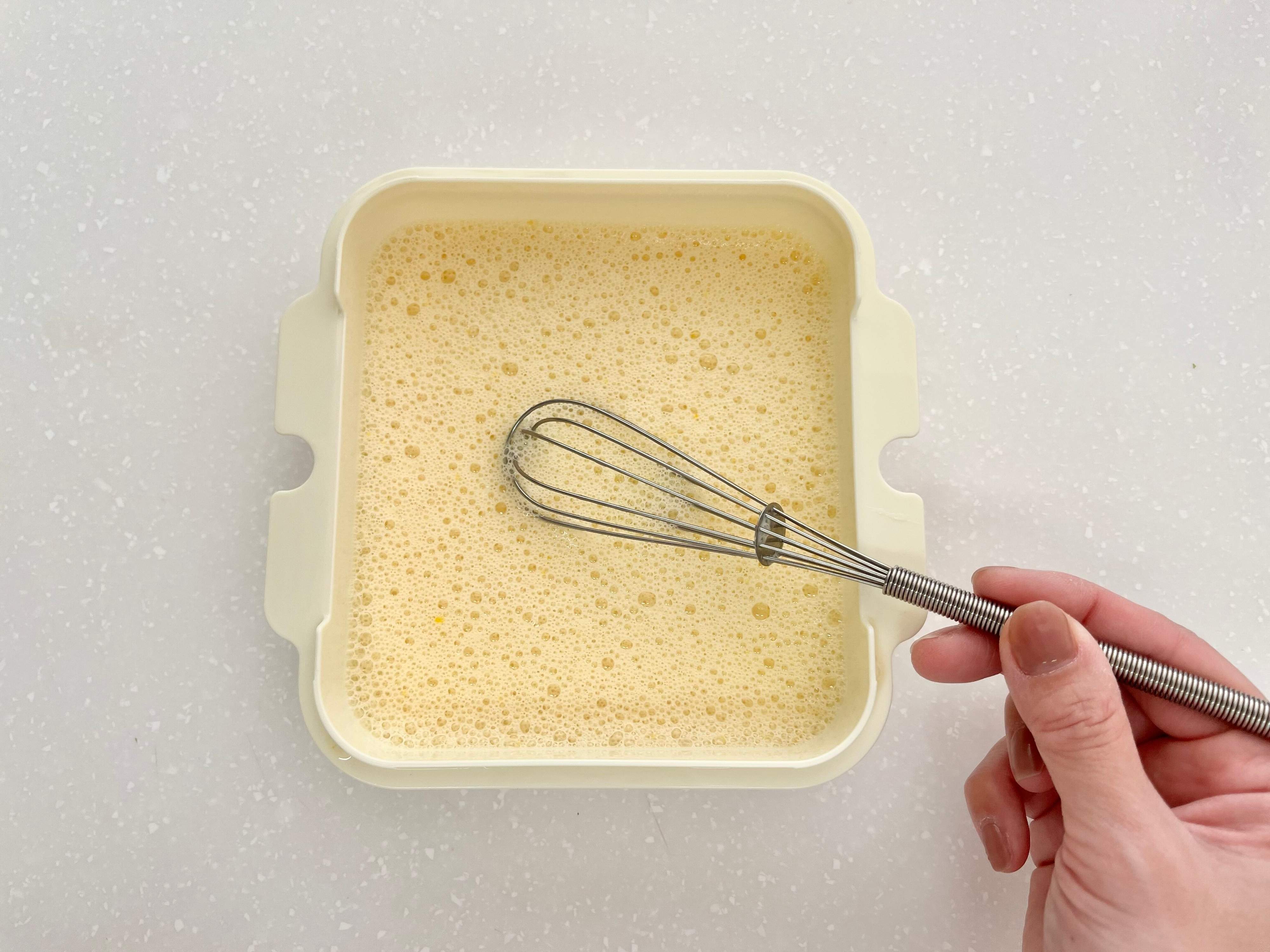 では、パッケージに記載のレシピでフレンチトーストを作ってみます。まず蓋とバスケットを外し、生たまご(1個)・牛乳(125cc)・砂糖(大さじ1)を容器に入れてよくかき混ぜます。