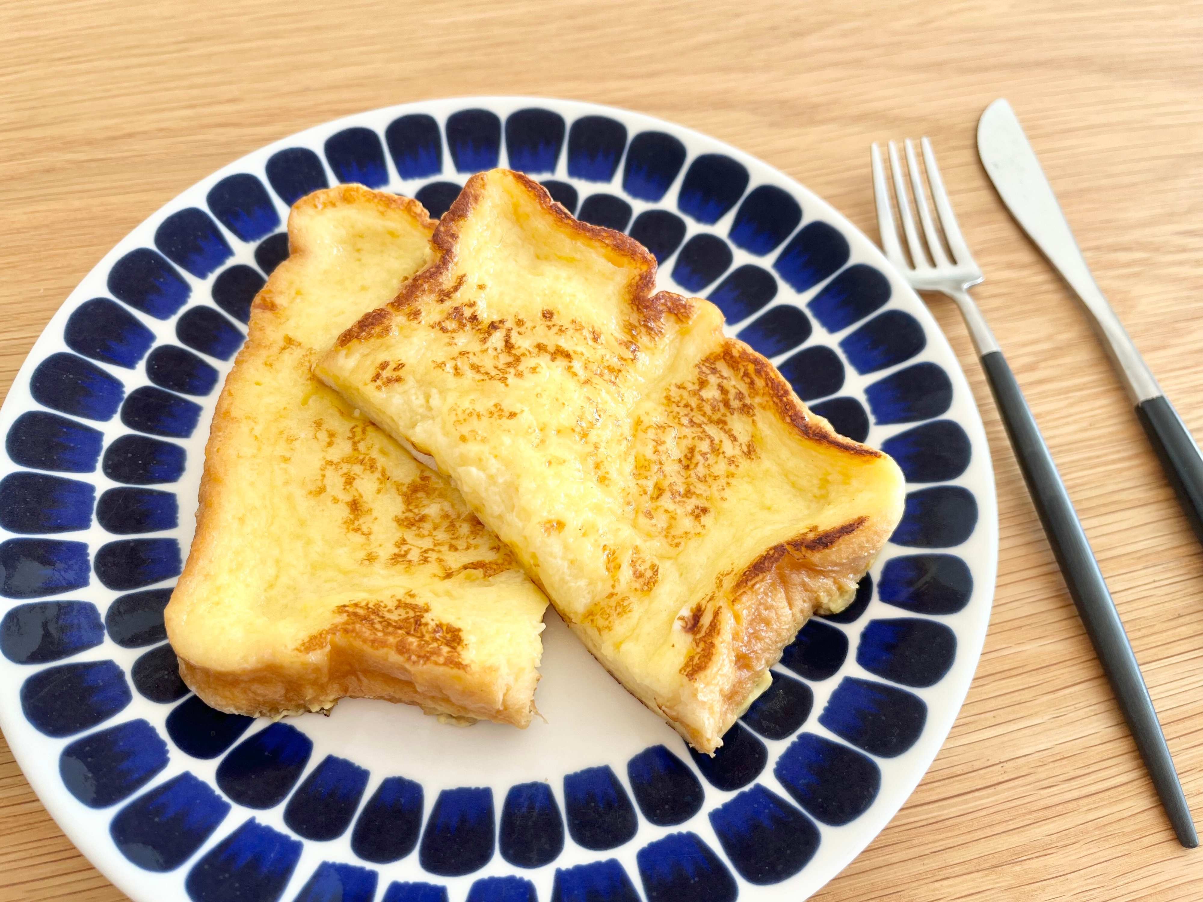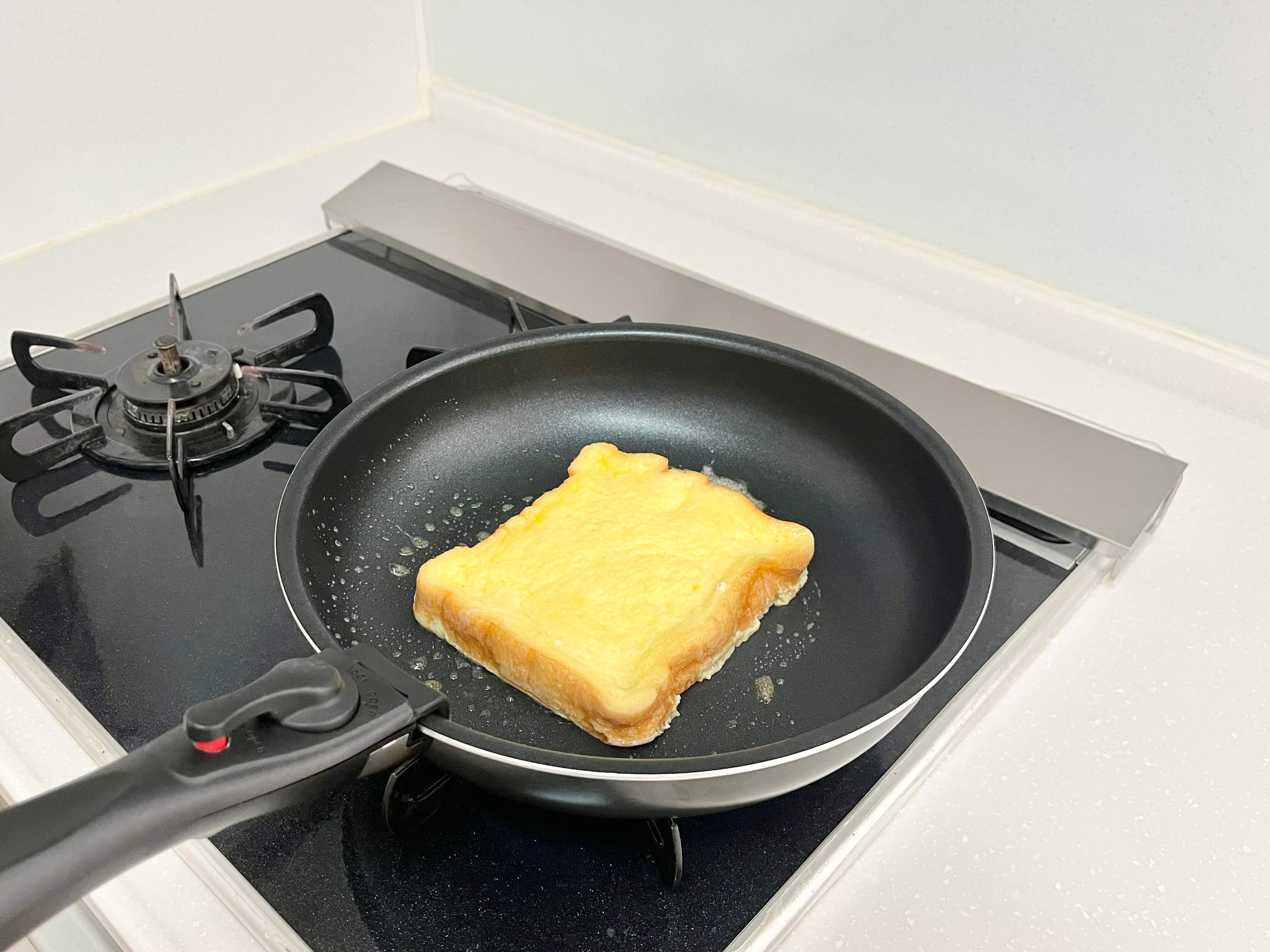 フライパンで焼いたフレンチトーストは、外はこんがりと香ばしくて、中はしっとりとしていて絶品!なにより卵液を無駄にすることなく作れるのが素晴らしいですよね。